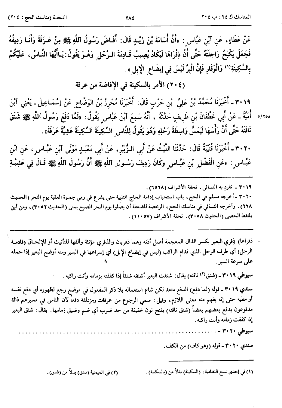 3020 - أَخْبَرَنَا قُتَيْبَةُ قَالَ حَدَّثَنَا اللَّيْثُ عَنْ أَبِي الزُّبَيْرِ عَنْ أَبِي مَعْبَدٍ مَوْلَى ابْنِ عَبَّاسٍ عَنْ ابْنِ عَبَّاسٍ عَنْ الْفَضْلِ بْنِ عَبَّاسٍ وَكَانَ رَدِيفَ رَسُولِ اللَّهِ صَلَّى اللَّهُ عَلَيْهِ وَسَلَّمَ أَنَّ رَسُولَ اللَّهِ صَلَّى اللَّهُ عَلَيْهِ وَسَلَّمَ قَالَ فِي عَشِيَّةِ عَرَفَةَ وَغَدَاةِ جَمْعٍ لِلنَّاسِ حِينَ دَفَعُوا عَلَيْكُمْ السَّكِينَةَ وَهُوَ كَافٌّ نَاقَتَهُ حَتَّى إِذَا دَخَلَ مُحَسِّرًا وَهُوَ مِنْ مِنًى قَالَ عَلَيْكُمْ بِحَصَى الْخَذْفِ الَّذِي يُرْمَى بِهِ فَلَمْ يَزَلْ رَسُولُ اللَّهِ صَلَّى اللَّهُ عَلَيْهِ وَسَلَّمَ يُلَبِّي حَتَّى رَمَى الْجَمْرَةَ