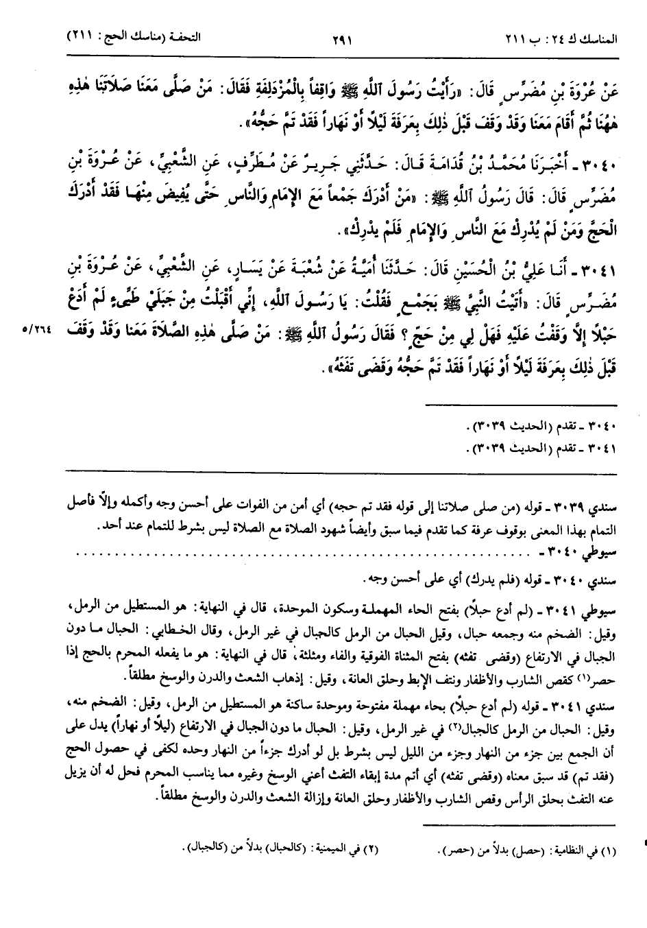 3041 - أَخْبَرَنَا عَلِيُّ بْنُ الْحُسَيْنِ قَالَ حَدَّثَنَا أُمَيَّةُ عَنْ شُعْبَةَ عَنْ سَيَّارٍ عَنْ الشَّعْبِيِّ عَنْ عُرْوَةَ بْنِ مُضَرِّسٍ قَالَ أَتَيْتُ النَّبِيَّ صَلَّى اللَّهُ عَلَيْهِ وَسَلَّمَ بِجَمْعٍ فَقُلْتُ يَا رَسُولَ اللَّهِ إِنِّي أَقْبَلْتُ مِنْ جَبَلَيْ طَيِّئٍ لَمْ أَدَعْ حَبْلًا إِلَّا وَقَفْتُ عَلَيْهِ فَهَلْ لِي مِنْ حَجٍّ فَقَالَ رَسُولُ اللَّهِ صَلَّى اللَّهُ عَلَيْهِ وَسَلَّمَ مَنْ صَلَّى هَذِهِ الصَّلَاةَ مَعَنَا وَقَدْ وَقَفَ قَبْلَ ذَلِكَ بِعَرَفَةَ لَيْلًا أَوْ نَهَارًا فَقَدْ تَمَّ حَجُّهُ وَقَضَى تَفَثَهُ