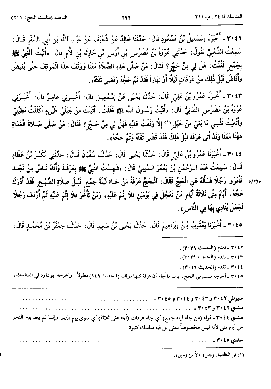 3043 - أَخْبَرَنَا عَمْرُو بْنُ عَلِيٍّ قَالَ حَدَّثَنَا يَحْيَى عَنْ إِسْمَعِيلَ قَالَ أَخْبَرَنِي عَامِرٌ قَالَ أَخْبَرَنِي عُرْوَةُ بْنُ مُضَرِّسٍ الطَّائِيُّ قَالَ أَتَيْتُ رَسُولَ اللَّهِ صَلَّى اللَّهُ عَلَيْهِ وَسَلَّمَ فَقُلْتُ أَتَيْتُكَ مِنْ جَبَلَيْ طَيِّئٍ أَكْلَلْتُ مَطِيَّتِي وَأَتْعَبْتُ نَفْسِي مَا بَقِيَ مِنْ حَبْلٍ إِلَّا وَقَفْتُ عَلَيْهِ فَهَلْ لِي مِنْ حَجٍّ فَقَالَ مَنْ صَلَّى صَلَاةَ الْغَدَاةِ هَا هُنَا مَعَنَا وَقَدْ أَتَى عَرَفَةَ قَبْلَ ذَلِكَ فَقَدْ قَضَى تَفَثَهُ وَتَمَّ حَجُّهُ