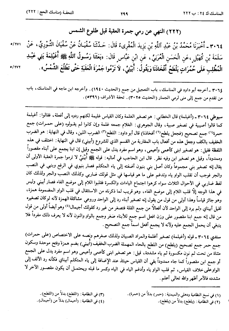 بَاب النَّهْيِ عَنْ رَمْيِ جَمْرَةِ الْعَقَبَةِ قَبْلَ طُلُوعِ الشَّمْسِ 3064 - أَخْبَرَنَا مُحَمَّدُ بْنُ عَبْدِ اللَّهِ بْنِ يَزِيدَ الْمُقْرِئُ قَالَ حَدَّثَنَا سُفْيَانُ عَنْ سُفْيَانَ الثَّوْرِيِّ عَنْ سَلَمَةَ بْنِ كُهَيْلٍ عَنْ الْحَسَنِ الْعُرَنِيِّ عَنْ ابْنِ عَبَّاسٍ قَالَ بَعَثَنَا رَسُولُ اللَّهِ صَلَّى اللَّهُ عَلَيْهِ وَسَلَّمَ أُغَيْلِمَةَ بَنِي عَبْدِ الْمُطَّلِبِ عَلَى حُمُرَاتٍ يَلْطَحُ أَفْخَاذَنَا وَيَقُولُ أُبَيْنِيَّ لَا تَرْمُوا جَمْرَةَ الْعَقَبَةِ حَتَّى تَطْلُعَ الشَّمْسُ