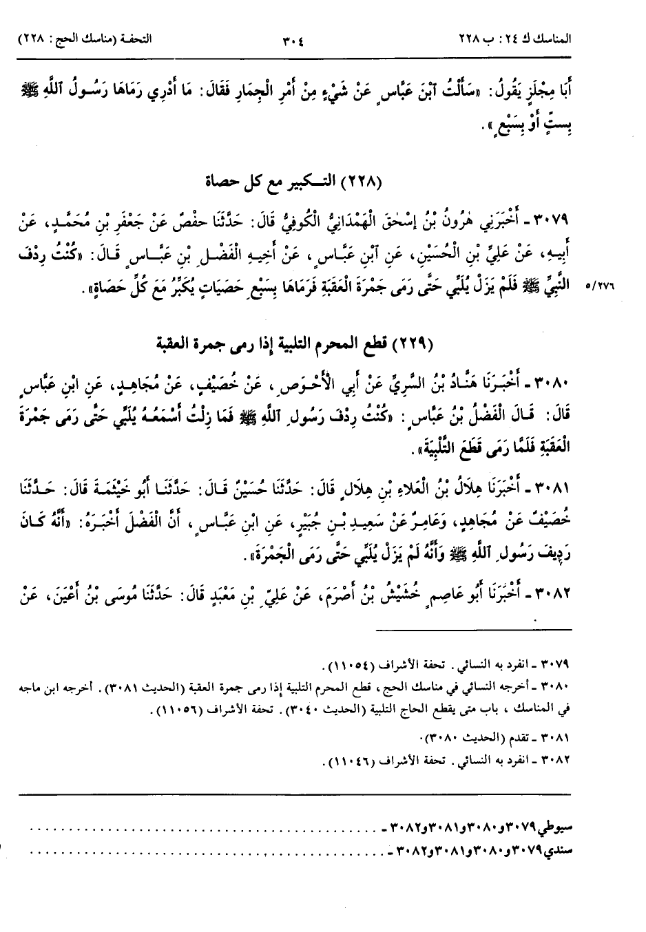 بَاب التَّكْبِيرِ مَعَ كُلِّ حَصَاةٍ 3079 - أَخْبَرَنِي هَارُونُ بْنُ إِسْحَقَ الْهَمْدَانِيُّ الْكُوفِيُّ قَالَ حَدَّثَنَا حَفْصٌ عَنْ جَعْفَرِ بْنِ مُحَمَّدٍ عَنْ أَبِيهِ عَنْ عَلِيِّ بْنِ الْحُسَيْنِ عَنْ ابْنِ عَبَّاسٍ عَنْ أَخِيهِ الْفَضْلِ بْنِ عَبَّاسٍ قَالَ كُنْتُ رِدْفَ النَّبِيِّ صَلَّى اللَّهُ عَلَيْهِ وَسَلَّمَ فَلَمْ يَزَلْ يُلَبِّي حَتَّى رَمَى جَمْرَةَ الْعَقَبَةِ فَرَمَاهَا بِسَبْعِ حَصَيَاتٍ يُكَبِّرُ مَعَ كُلِّ حَصَاةٍ