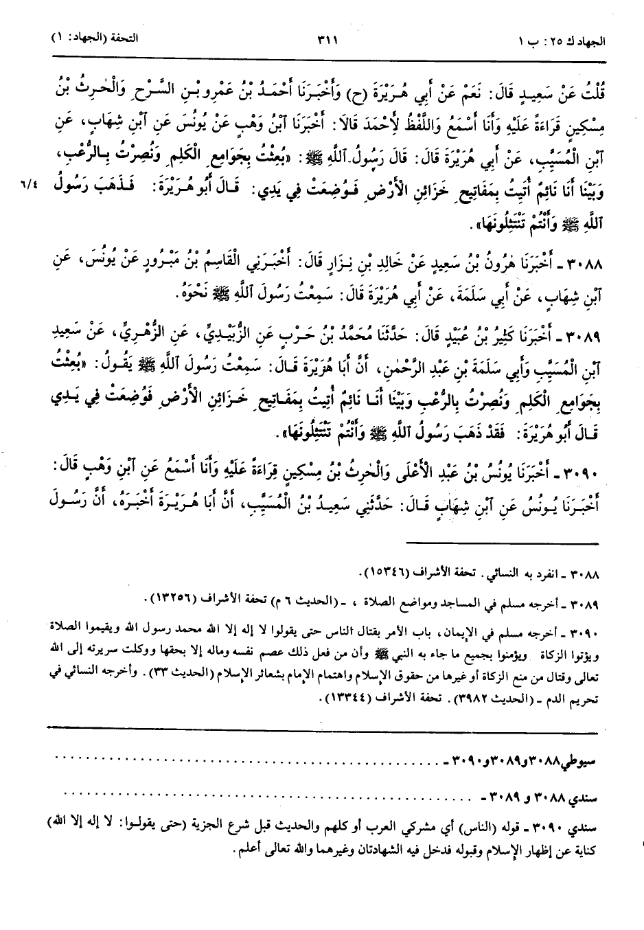 3089 - أَخْبَرَنَا كَثِيرُ بْنُ عُبَيْدٍ قَالَ حَدَّثَنَا مُحَمَّدُ بْنُ حَرْبٍ عَنْ الزُّبَيْدِيِّ عَنْ الزُّهْرِيِّ عَنْ سَعِيدِ بْنِ الْمُسَيَّبِ وَأَبِي سَلَمَةَ بْنِ عَبْدِ الرَّحْمَنِ أَنَّ أَبَا هُرَيْرَةَ قَالَ سَمِعْتُ رَسُولَ اللَّهِ صَلَّى اللَّهُ عَلَيْهِ وَسَلَّمَ يَقُولُ بُعِثْتُ بِجَوَامِعِ الْكَلِمِ وَنُصِرْتُ بِالرُّعْبِ وَبَيْنَا أَنَا نَائِمٌ أُتِيتُ بِمَفَاتِيحِ خَزَائِنِ الْأَرْضِ فَوُضِعَتْ فِي يَدِي فَقَالَ أَبُو هُرَيْرَةَ فَقَدْ ذَهَبَ رَسُولُ اللَّهِ صَلَّى اللَّهُ عَلَيْهِ وَسَلَّمَ وَأَنْتُمْ تَنْتَثِلُونَهَا