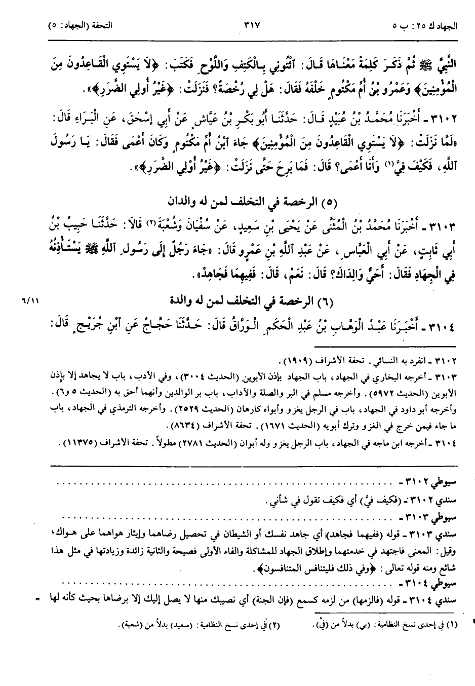 3102 - أَخْبَرَنَا مُحَمَّدُ بْنُ عُبَيْدٍ قَالَ حَدَّثَنَا أَبُو بَكْرِ بْنُ عَيَّاشٍ عَنْ أَبِي إِسْحَقَ عَنْ الْبَرَاءِ قَالَ لَمَّا نَزَلَتْ { لَا يَسْتَوِي الْقَاعِدُونَ مِنْ الْمُؤْمِنِينَ } جَاءَ ابْنُ أُمِّ مَكْتُومٍ وَكَانَ أَعْمَى فَقَالَ يَا رَسُولَ اللَّهِ فَكَيْفَ فِيَّ وَأَنَا أَعْمَى قَالَ فَمَا بَرِحَ حَتَّى نَزَلَتْ { غَيْرُ أُولِي الضَّرَرِ }