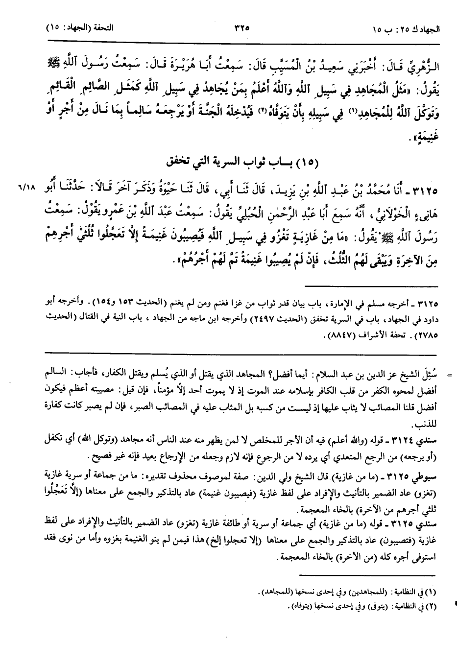 بَاب ثَوَابِ السَّرِيَّةِ الَّتِي تُخْفِقُ 3125 - أَخْبَرَنَا مُحَمَّدُ بْنُ عَبْدِ اللَّهِ بْنِ يَزِيدَ قَالَ حَدَّثَنَا أَبِي قَالَ حَدَّثَنَا حَيْوَةُ وَذَكَرَ آخَرَ قَالَا حَدَّثَنَا أَبُو هَانِئٍ الْخَوْلَانِيُّ أَنَّهُ سَمِعَ أَبَا عَبْدِ الرَّحْمَنِ الْحُبُلِيَّ يَقُولُ سَمِعْتُ عَبْدَ اللَّهِ بْنَ عَمْرٍو يَقُولُ سَمِعْتُ رَسُولَ اللَّهِ صَلَّى اللَّهُ عَلَيْهِ وَسَلَّمَ يَقُولُ مَا مِنْ غَازِيَةٍ تَغْزُو فِي سَبِيلِ اللَّهِ فَيُصِيبُونَ غَنِيمَةً إِلَّا تَعَجَّلُوا ثُلُثَيْ أَجْرِهِمْ مِنْ الْآخِرَةِ وَيَبْقَى لَهُمْ الثُّلُثُ فَإِنْ لَمْ يُصِيبُوا غَنِيمَةً تَمَّ لَهُمْ أَجْرُهُمْ