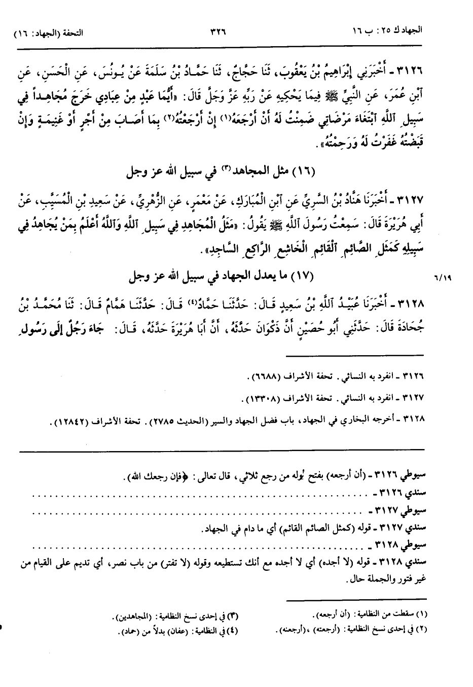 3126 - أَخْبَرَنِي إِبْرَاهِيمُ بْنُ يَعْقُوبَ قَالَ حَدَّثَنَا حَجَّاجٌ قَالَ حَدَّثَنَا حَمَّادُ بْنُ سَلَمَةَ عَنْ يُونُسَ عَنْ الْحَسَنِ عَنْ ابْنِ عُمَرَ عَنْ النَّبِيِّ صَلَّى اللَّهُ عَلَيْهِ وَسَلَّمَ فِيمَا يَحْكِيهِ عَنْ رَبِّهِ عَزَّ وَجَلَّ قَالَ أَيُّمَا عَبْدٍ مِنْ عِبَادِي خَرَجَ مُجَاهِدًا فِي سَبِيلِ اللَّهِ ابْتِغَاءَ مَرْضَاتِي ضَمِنْتُ لَهُ أَنْ أَرْجِعَهُ إِنْ أَرْجَعْتُهُ بِمَا أَصَابَ مِنْ أَجْرٍ أَوْ غَنِيمَةٍ وَإِنْ قَبَضْتُهُ غَفَرْتُ لَهُ وَرَحِمْتُهُ