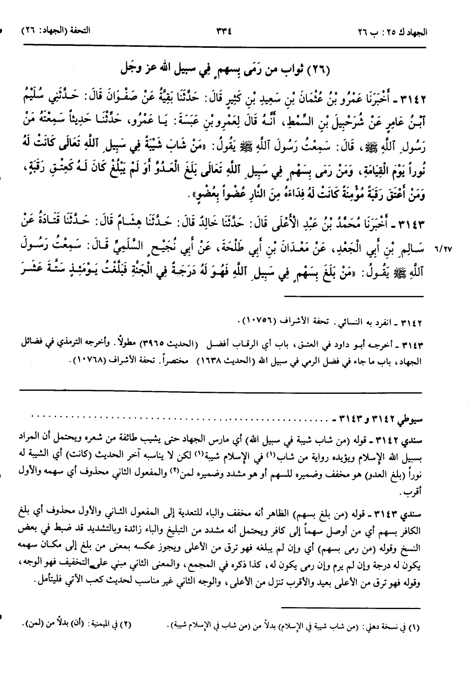 3143 - أَخْبَرَنَا مُحَمَّدُ بْنُ عَبْدِ الْأَعْلَى قَالَ حَدَّثَنَا خَالِدٌ قَالَ حَدَّثَنَا هِشَامٌ قَالَ حَدَّثَنَا قَتَادَةُ عَنْ سَالِمِ بْنِ أَبِي الْجَعْدِ عَنْ مَعْدَانَ بْنِ أَبِي طَلْحَةَ عَنْ أَبِي نَجِيحٍ السَّلَمِيِّ قَالَ سَمِعْتُ رَسُولَ اللَّهِ صَلَّى اللَّهُ عَلَيْهِ وَسَلَّمَ يَقُولُ مَنْ بَلَغَ بِسَهْمٍ فِي سَبِيلِ اللَّهِ فَهُوَ لَهُ دَرَجَةٌ فِي الْجَنَّةِ فَبَلَّغْتُ يَوْمَئِذٍ سِتَّةَ عَشَرَ سَهْمًا قَالَ وَسَمِعْتُ رَسُولَ اللَّهِ صَلَّى اللَّهُ عَلَيْهِ وَسَلَّمَ يَقُولُ مَنْ رَمَى بِسَهْمٍ فِي سَبِيلِ اللَّهِ فَهُوَ عِدْلُ مُحَرَّرٍ
