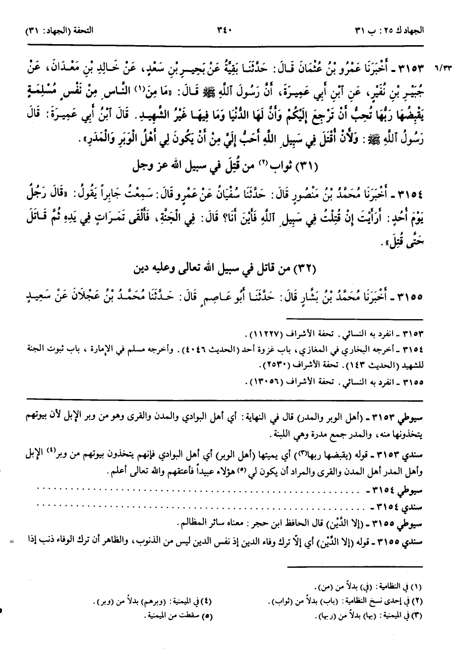 3153 - أَخْبَرَنَا عَمْرُو بْنُ عُثْمَانَ قَالَ حَدَّثَنَا بَقِيَّةُ عَنْ بَحِيرِ بْنِ سَعْدٍ عَنْ خَالِدِ بْنِ مَعْدَانَ عَنْ جُبَيْرِ بْنِ نُفَيْرٍ عَنْ ابْنِ أَبِي عَمِيرَةَ أَنَّ رَسُولَ اللَّهِ صَلَّى اللَّهُ عَلَيْهِ وَسَلَّمَ قَالَ مَا مِنْ النَّاسِ مِنْ نَفْسٍ مُسْلِمَةٍ يَقْبِضُهَا رَبُّهَا تُحِبُّ أَنْ تَرْجِعَ إِلَيْكُمْ وَأَنَّ لَهَا الدُّنْيَا وَمَا فِيهَا غَيْرُ الشَّهِيدِ قَالَ ابْنُ أَبِي عَمِيرَةَ قَالَ رَسُولُ اللَّهِ صَلَّى اللَّهُ عَلَيْهِ وَسَلَّمَ وَلَأَنْ أُقْتَلَ فِي سَبِيلِ اللَّهِ أَحَبُّ إِلَيَّ مِنْ أَنْ يَكُونَ لِي أَهْلُ الْوَبَرِ وَالْمَدَرِ