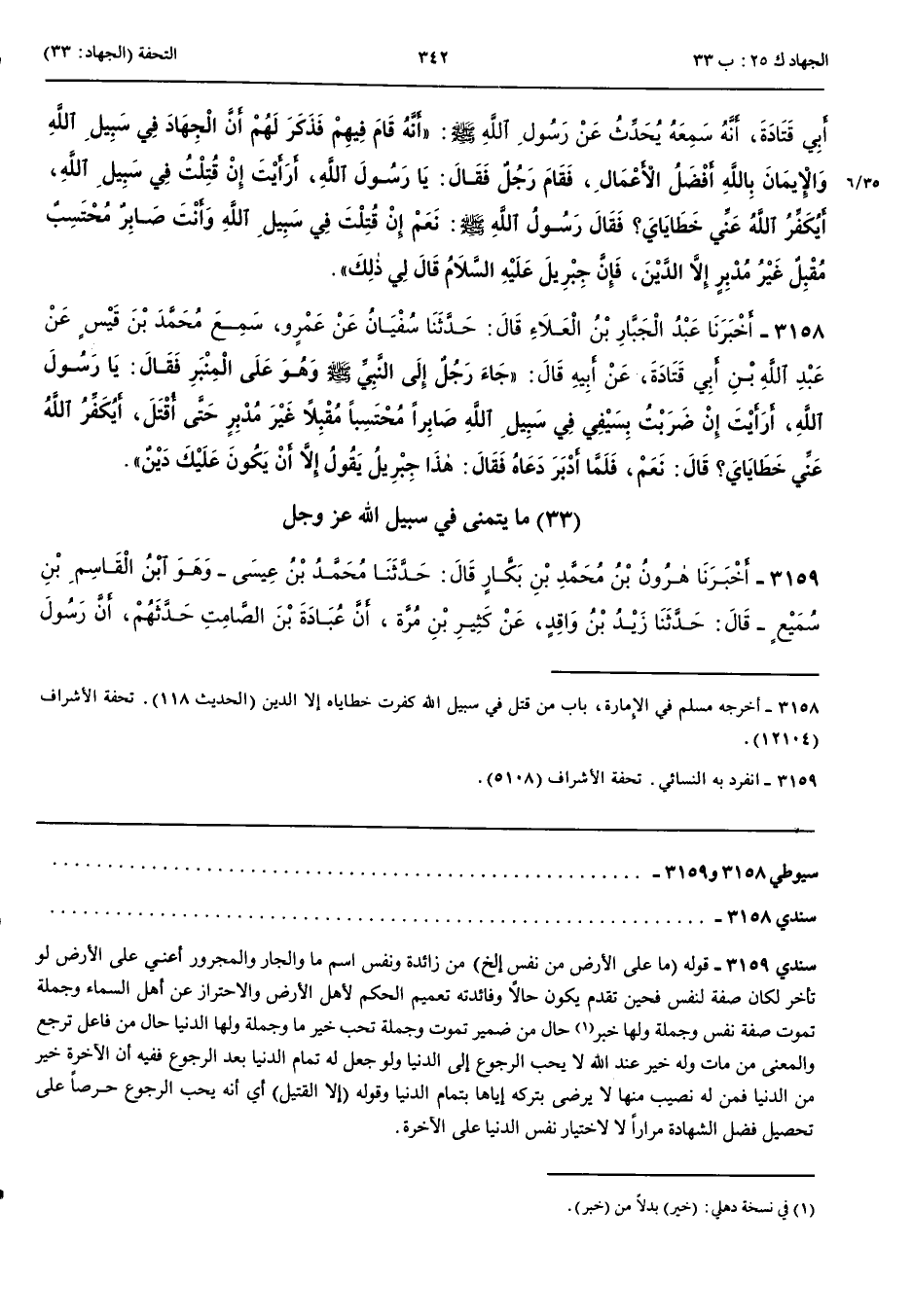 مَا يَتَمَنَّى فِي سَبِيلِ اللَّهِ عَزَّ وَجَلَّ 3159 - أَخْبَرَنَا هَارُونُ بْنُ مُحَمَّدِ بْنِ بَكَّارٍ قَالَ حَدَّثَنَا مُحَمَّدُ بْنُ عِيسَى وَهُوَ ابْنُ الْقَاسِمِ بْنِ سُمَيْعٍ قَالَ حَدَّثَنَا زَيْدُ بْنُ وَاقِدٍ عَنْ كَثِيرِ بْنِ مُرَّةَ أَنَّ عُبَادَةَ بْنَ الصَّامِتِ حَدَّثَهُمْ أَنَّ رَسُولَ اللَّهِ صَلَّى اللَّهُ عَلَيْهِ وَسَلَّمَ قَالَ مَا عَلَى الْأَرْضِ مِنْ نَفْسٍ تَمُوتُ وَلَهَا عِنْدَ اللَّهِ خَيْرٌ تُحِبُّ أَنْ تَرْجِعَ إِلَيْكُمْ وَلَهَا الدُّنْيَا إِلَّا الْقَتِيلُ فَإِنَّهُ يُحِبُّ أَنْ يَرْجِعَ فَيُقْتَلَ مَرَّةً أُخْرَى
