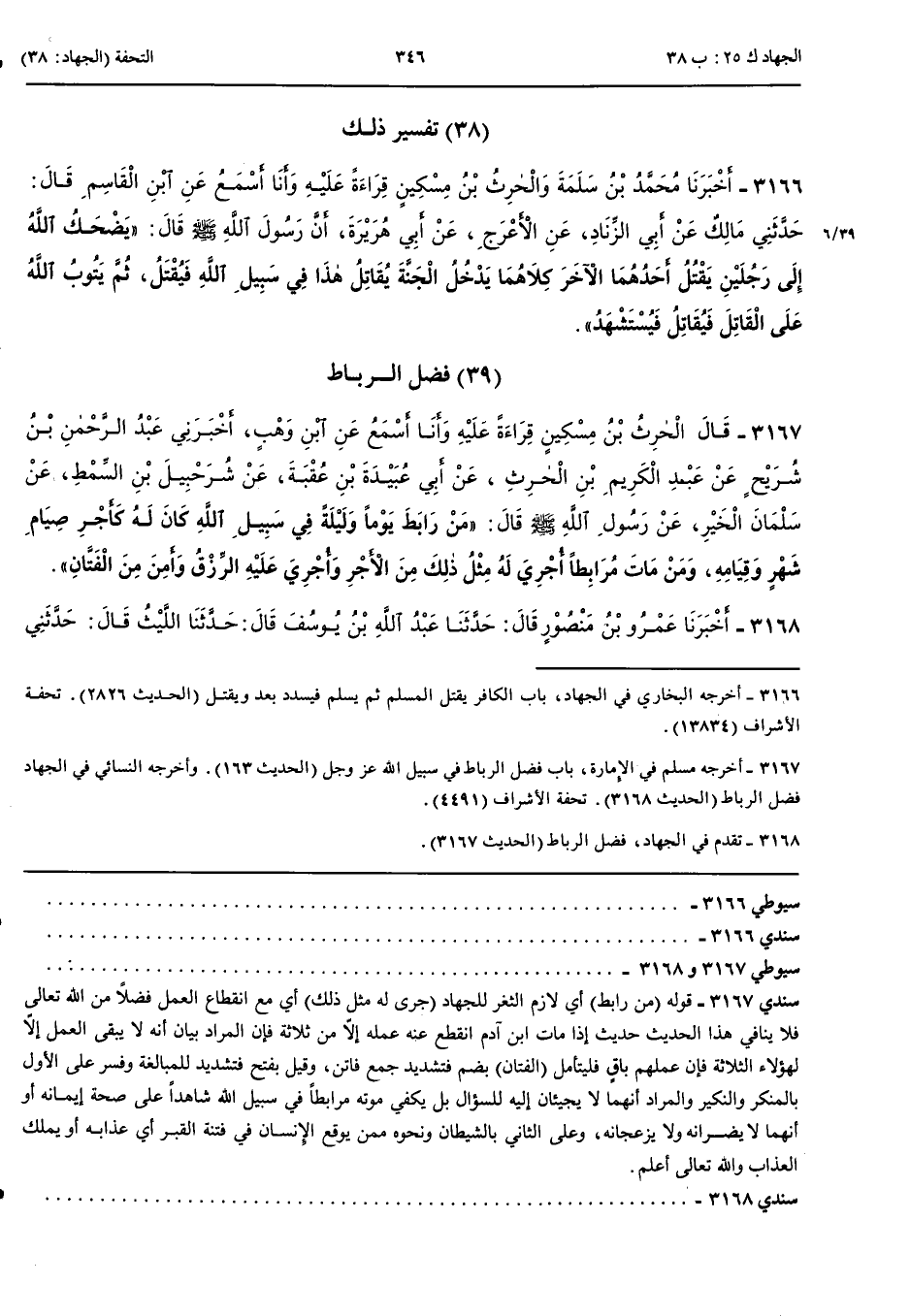 تَفْسِيرُ ذَلِكَ 3166 - أَخْبَرَنَا مُحَمَّدُ بْنُ سَلَمَةَ وَالْحَارِثُ بْنُ مِسْكِينٍ قِرَاءَةً عَلَيْهِ وَأَنَا أَسْمَعُ عَنْ ابْنِ الْقَاسِمِ قَالَ حَدَّثَنِي مَالِكٌ عَنْ أَبِي الزِّنَادِ عَنْ الْأَعْرَجِ عَنْ أَبِي هُرَيْرَةَ أَنَّ رَسُولَ اللَّهِ صَلَّى اللَّهُ عَلَيْهِ وَسَلَّمَ قَالَ يَضْحَكُ اللَّهُ إِلَى رَجُلَيْنِ يَقْتُلُ أَحَدُهُمَا الْآخَرَ كِلَاهُمَا يَدْخُلُ الْجَنَّةَ يُقَاتِلُ هَذَا فِي سَبِيلِ اللَّهِ فَيُقْتَلُ ثُمَّ يَتُوبُ اللَّهُ عَلَى الْقَاتِلِ فَيُقَاتِلُ فَيُسْتَشْهَدُ