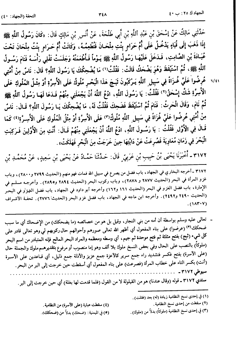 3172 - أَخْبَرَنَا يَحْيَى بْنُ حَبِيبِ بْنِ عَرَبِيٍّ قَالَ حَدَّثَنَا حَمَّادٌ عَنْ يَحْيَى بْنِ سَعِيدٍ عَنْ مُحَمَّدِ بْنِ يَحْيَى بْنِ حَبَّانَ عَنْ أَنَسِ بْنِ مَالِكٍ عَنْ أُمِّ حَرَامٍ بِنْتِ مِلْحَانَ قَالَتْ أَتَانَا رَسُولُ اللَّهِ صَلَّى اللَّهُ عَلَيْهِ وَسَلَّمَ وَقَالَ عِنْدَنَا فَاسْتَيْقَظَ وَهُوَ يَضْحَكُ فَقُلْتُ يَا رَسُولَ اللَّهِ بِأَبِي وَأُمِّي مَا أَضْحَكَكَ قَالَ رَأَيْتُ قَوْمًا مِنْ أُمَّتِي يَرْكَبُونَ هَذَا الْبَحْرَ كَالْمُلُوكِ عَلَى الْأَسِرَّةِ قُلْتُ ادْعُ اللَّهَ أَنْ يَجْعَلَنِي مِنْهُمْ قَالَ فَإِنَّكِ مِنْهُمْ ثُمَّ نَامَ ثُمَّ اسْتَيْقَظَ وَهُوَ يَضْحَكُ فَسَأَلْتُهُ فَقَالَ يَعْنِي مِثْلَ مَقَالَتِهِ قُلْتُ ادْعُ اللَّهَ أَنْ يَجْعَلَنِي مِنْهُمْ قَالَ أَنْتِ مِنْ الْأَوَّلِينَ فَتَزَوَّجَهَا عُبَادَةُ بْنُ الصَّامِتِ فَرَكِبَ الْبَحْرَ وَرَكِبَتْ مَعَهُ فَلَمَّا خَرَجَتْ قُدِّمَتْ لَهَا بَغْلَةٌ فَرَكِبَتْهَا فَصَرَعَتْهَا فَانْدَقَّتْ عُنُقُهَا