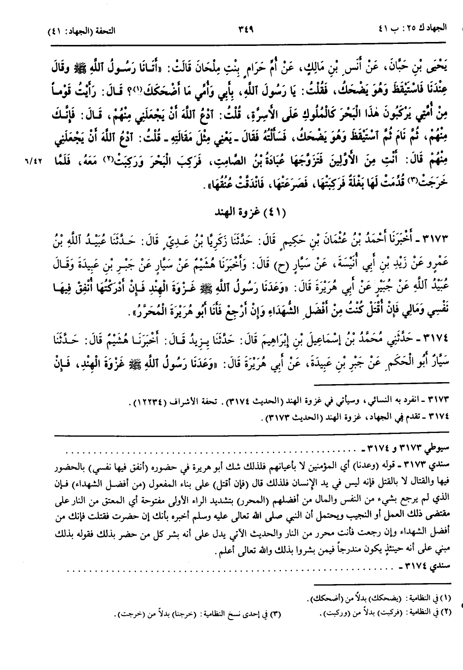 غَزْوَةُ الْهِنْدِ 3173 - أَخْبَرَنَا أَحْمَدُ بْنُ عُثْمَانَ بْنِ حَكِيمٍ قَالَ حَدَّثَنَا زَكَرِيَّا بْنُ عَدِيٍّ قَالَ حَدَّثَنَا عُبَيْدُ اللَّهِ بْنُ عَمْرٍو عَنْ زَيْدِ بْنِ أَبِي أُنَيْسَةَ عَنْ سَيَّارٍ ح قَالَ وَأَنْبَأَنَا هُشَيْمٌ عَنْ سَيَّارٍ عَنْ جَبْرِ بْنِ عَبِيدَةَ وَقَالَ عُبَيْدُ اللَّهِ عَنْ جُبَيْرٍ عَنْ أَبِي هُرَيْرَةَ قَالَ وَعَدَنَا رَسُولُ اللَّهِ صَلَّى اللَّهُ عَلَيْهِ وَسَلَّمَ غَزْوَةَ الْهِنْدِ فَإِنْ أَدْرَكْتُهَا أُنْفِقْ فِيهَا نَفْسِي وَمَالِي فَإِنْ أُقْتَلْ كُنْتُ مِنْ أَفْضَلِ الشُّهَدَاءِ وَإِنْ أَرْجِعْ فَأَنَا أَبُو هُرَيْرَةَ الْمُحَرَّرُ