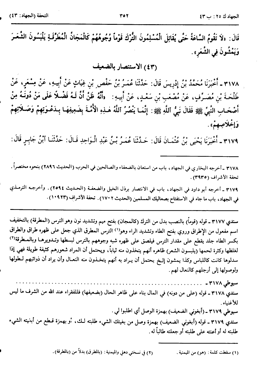 الِاسْتِنْصَارُ بِالضَّعِيفِ 3178 - أَخْبَرَنَا مُحَمَّدُ بْنُ إِدْرِيسَ قَالَ حَدَّثَنَا عُمَرُ بْنُ حَفْصِ بْنِ غِيَاثٍ عَنْ أَبِيهِ عَنْ مِسْعَرٍ عَنْ طَلْحَةَ بْنِ مُصَرِّفٍ عَنْ مُصْعَبِ بْنِ سَعْدٍ عَنْ أَبِيهِ أَنَّهُ ظَنَّ أَنَّ لَهُ فَضْلًا عَلَى مَنْ دُونَهُ مِنْ أَصْحَابِ النَّبِيِّ صَلَّى اللَّهُ عَلَيْهِ وَسَلَّمَ فَقَالَ نَبِيُّ اللَّهِ صَلَّى اللَّهُ عَلَيْهِ وَسَلَّمَ إِنَّمَا يَنْصُرُ اللَّهُ هَذِهِ الْأُمَّةَ بِضَعِيفِهَا بِدَعْوَتِهِمْ وَصَلَاتِهِمْ وَإِخْلَاصِهِمْ