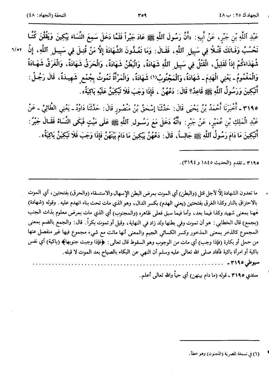 3195 - أَخْبَرَنَا أَحْمَدُ بْنُ يَحْيَى قَالَ حَدَّثَنَا إِسْحَقُ بْنُ مَنْصُورٍ قَالَ حَدَّثَنَا دَاوُدُ يَعْنِي الطَّائِيَّ عَنْ عَبْدِ الْمَلِكِ بْنِ عُمَيْرٍ عَنْ جَبْرٍ أَنَّهُ دَخَلَ مَعَ رَسُولِ اللَّهِ صَلَّى اللَّهُ عَلَيْهِ وَسَلَّمَ عَلَى مَيِّتٍ فَبَكَى النِّسَاءُ فَقَالَ جَبْرٌ أَتَبْكِينَ مَا دَامَ رَسُولُ اللَّهِ صَلَّى اللَّهُ عَلَيْهِ وَسَلَّمَ جَالِسًا قَالَ دَعْهُنَّ يَبْكِينَ مَا دَامَ بَيْنَهُنَّ فَإِذَا وَجَبَ فَلَا تَبْكِيَنَّ بَاكِيَةٌ