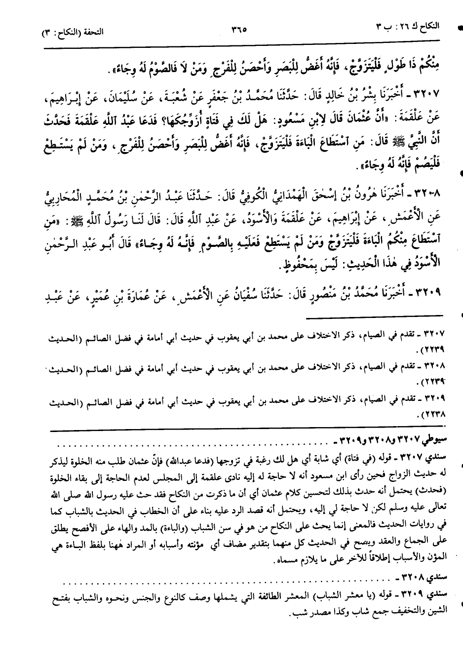 3209 - أَخْبَرَنَا مُحَمَّدُ بْنُ مَنْصُورٍ قَالَ حَدَّثَنَا سُفْيَانُ عَنْ الْأَعْمَشِ عَنْ عُمَارَةَ بْنِ عُمَيْرٍ عَنْ عَبْدِ الرَّحْمَنِ بْنِ يَزِيدَ عَنْ عَبْدِ اللَّهِ قَالَ قَالَ لَنَا رَسُولُ اللَّهِ صَلَّى اللَّهُ عَلَيْهِ وَسَلَّمَ يَا مَعْشَرَ الشَّبَابِ مَنْ اسْتَطَاعَ مِنْكُمْ الْبَاءَةَ فَلْيَنْكِحْ فَإِنَّهُ أَغَضُّ لِلْبَصَرِ وَأَحْصَنُ لِلْفَرْجِ وَمَنْ لَا فَلْيَصُمْ فَإِنَّ الصَّوْمَ لَهُ وِجَاءٌ 3210 - أَخْبَرَنَا مُحَمَّدُ بْنُ الْعَلَاءِ قَالَ حَدَّثَنَا أَبُو مُعَاوِيَةَ عَنْ الْأَعْمَشِ عَنْ عُمَارَةَ عَنْ عَبْدِ الرَّحْمَنِ بْنِ يَزِيدَ عَنْ عَبْدِ اللَّهِ قَالَ قَالَ لَنَا رَسُولُ اللَّهِ صَلَّى اللَّهُ عَلَيْهِ وَسَلَّمَ يَا مَعْشَرَ الشَّبَابِ مَنْ اسْتَطَاعَ مِنْكُمْ الْبَاءَةَ فَلْيَتَزَوَّجْ وَسَاقَ الْحَدِيثَ