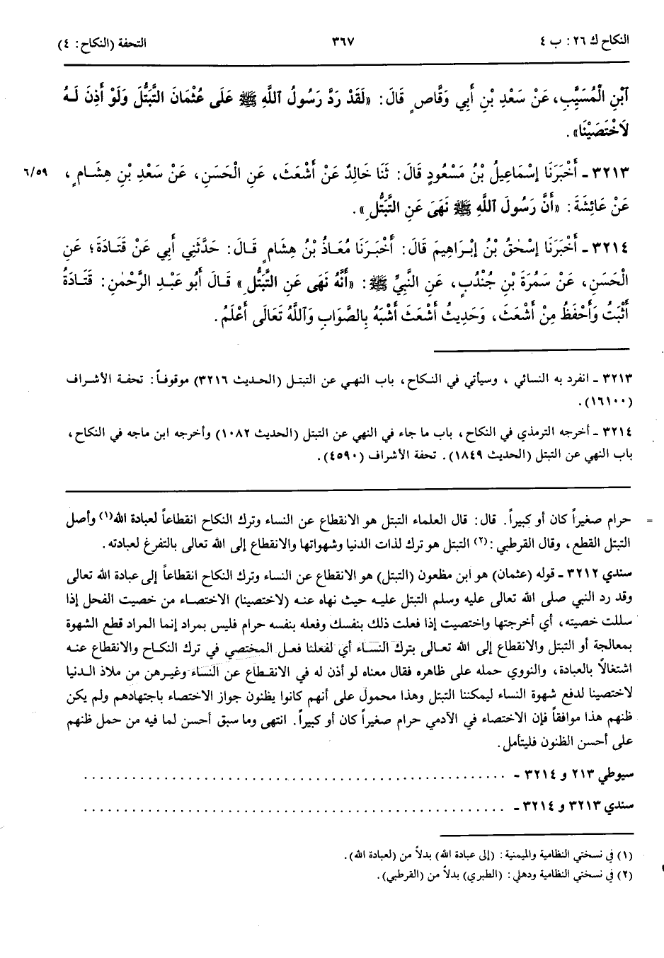 3213 - أَخْبَرَنَا إِسْمَعِيلُ بْنُ مَسْعُودٍ قَالَ حَدَّثَنَا خَالِدٌ عَنْ أَشْعَثَ عَنْ الْحَسَنِ عَنْ سَعْدِ بْنِ هِشَامٍ عَنْ عَائِشَةَ أَنَّ رَسُولَ اللَّهِ صَلَّى اللَّهُ عَلَيْهِ وَسَلَّمَ نَهَى عَنْ التَّبَتُّلِ