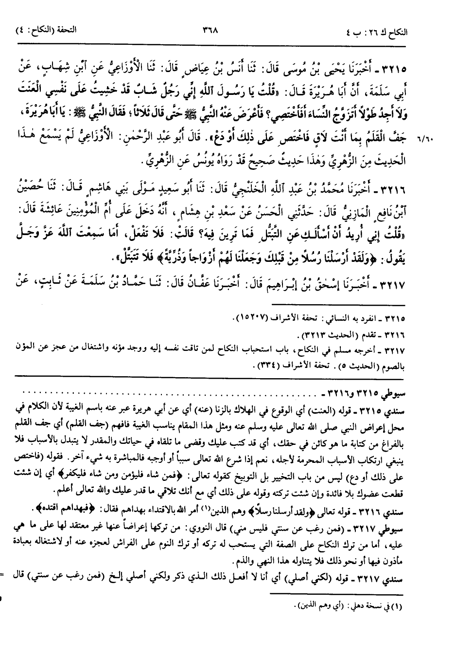 3215 - أَخْبَرَنَا يَحْيَى بْنُ مُوسَى قَالَ حَدَّثَنَا أَنَسُ بْنُ عِيَاضٍ قَالَ حَدَّثَنَا الْأَوْزَاعِيُّ عَنْ ابْنِ شِهَابٍ عَنْ أَبِي سَلَمَةَ أَنَّ أَبَا هُرَيْرَةَ قَالَ قُلْتُ يَا رَسُولَ اللَّهِ إِنِّي رَجُلٌ شَابٌّ قَدْ خَشِيتُ عَلَى نَفْسِيَ الْعَنَتَ وَلَا أَجِدُ طَوْلًا أَتَزَوَّجُ النِّسَاءَ أَفَأَخْتَصِي فَأَعْرَضَ عَنْهُ النَّبِيُّ صَلَّى اللَّهُ عَلَيْهِ وَسَلَّمَ حَتَّى قَالَ ثَلَاثًا فَقَالَ النَّبِيُّ صَلَّى اللَّهُ عَلَيْهِ وَسَلَّمَ يَا أَبَا هُرَيْرَةَ جَفَّ الْقَلَمُ بِمَا أَنْتَ لَاقٍ فَاخْتَصِ عَلَى ذَلِكَ أَوْ دَعْ قَالَ أَبُو عَبْد الرَّحْمَنِ الْأَوْزَاعِيُّ لَمْ يَسْمَعْ هَذَا الْحَدِيثَ مِنْ الزُّهْرِيِّ وَهَذَا حَدِيثٌ صَحِيحٌ قَدْ رَوَاهُ يُونُسُ عَنْ الزُّهْرِيِّ