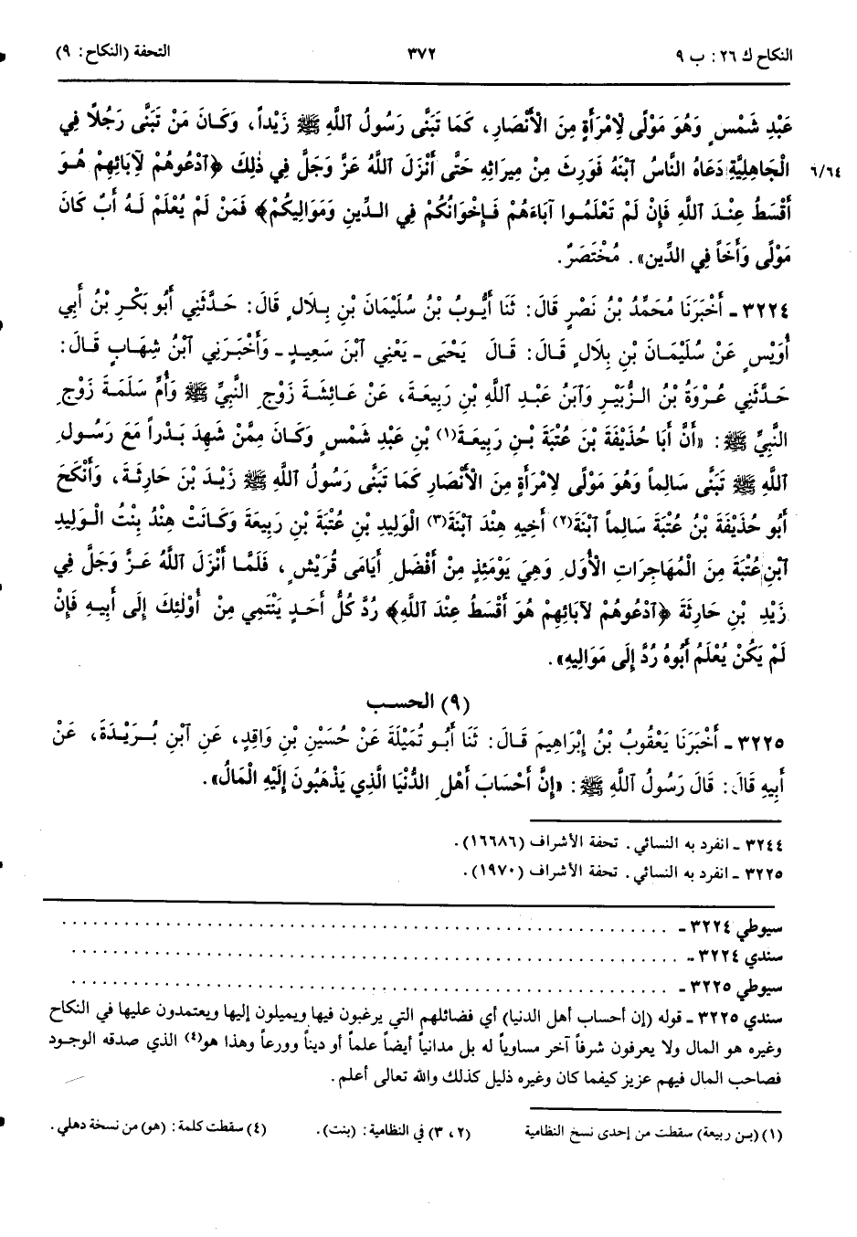 3224 - أَخْبَرَنَا مُحَمَّدُ بْنُ نَصْرٍ قَالَ حَدَّثَنَا أَيُّوبُ بْنُ سُلَيْمَانَ بْنِ بِلَالٍ قَالَ حَدَّثَنِي أَبُو بَكْرِ بْنُ أَبِي أُوَيْسٍ عَنْ سُلَيْمَانَ بْنِ بِلَالٍ قَالَ قَالَ يَحْيَى يَعْنِي ابْنَ سَعِيدٍ وَأَخْبَرَنِي ابْنُ شِهَابٍ قَالَ حَدَّثَنِي عُرْوَةُ بْنُ الزُّبَيْرِ وَابْنُ عَبْدِ اللَّهِ بْنِ رَبِيعَةَ عَنْ عَائِشَةَ زَوْجِ النَّبِيِّ صَلَّى اللَّهُ عَلَيْهِ وَسَلَّمَ وَأُمِّ سَلَمَةَ زَوْجِ النَّبِيِّ صَلَّى اللَّهُ عَلَيْهِ وَسَلَّمَ أَنَّ أَبَا حُذَيْفَةَ بْنَ عُتْبَةَ بْنِ رَبِيعَةَ بْنِ عَبْدِ شَمْسٍ وَكَانَ مِمَّنْ شَهِدَ بَدْرًا مَعَ رَسُولِ اللَّهِ صَلَّى اللَّهُ عَلَيْهِ وَسَلَّمَ تَبَنَّى سَالِمًا وَهُوَ مَوْلًى لِامْرَأَةٍ مِنْ الْأَنْصَارِ كَمَا تَبَنَّى رَسُولُ اللَّهِ صَلَّى اللَّهُ عَلَيْهِ وَسَلَّمَ زَيْدَ بْنَ حَارِثَةَ وَأَنْكَحَ أَبُو حُذَيْفَةَ بْنُ عُتْبَةَ سَالِمًا ابْنَةَ أَخِيهِ هِنْدَ ابْنَةَ الْوَلِيدِ بْنِ عُتْبَةَ بْنِ رَبِيعَةَ وَكَانَتْ هِنْدُ بِنْتُ الْوَلِيدِ بْنِ عُتْبَةَ مِنْ الْمُهَاجِرَاتِ الْأُوَلِ وَهِيَ يَوْمَئِذٍ مِنْ أَفْضَلِ أَيَامَى قُرَيْشٍ فَلَمَّا أَنْزَلَ اللَّهُ عَزَّ وَجَلَّ فِي زَيْدِ بْنِ حَارِثَةَ { ادْعُوهُمْ لِآبَائِهِمْ هُوَ أَقْسَطُ عِنْدَ اللَّهِ } رُدَّ كُلُّ أَحَدٍ يَنْتَمِي مِنْ أُولَئِكَ إِلَى أَبِيهِ فَإِنْ لَمْ يَكُنْ يُعْلَمُ أَبُوهُ رُدَّ إِلَى مَوَالِيهِ