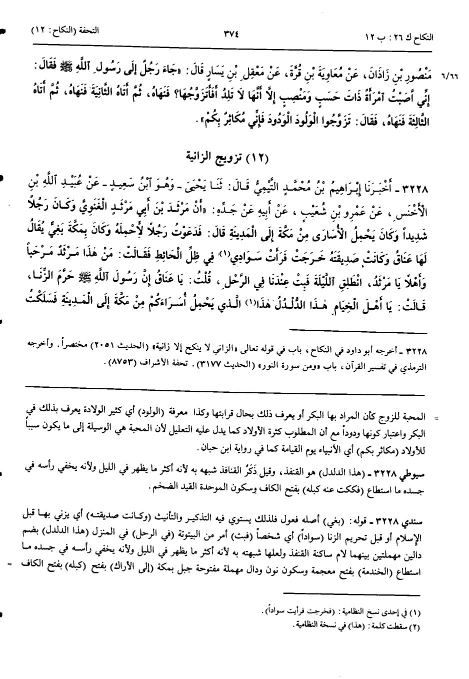 تَزْوِيجُ الزَّانِيَةِ 3228 - أَخْبَرَنَا إِبْرَاهِيمُ بْنُ مُحَمَّدٍ التَّيْمِيُّ قَالَ حَدَّثَنَا يَحْيَى هُوَ ابْنُ سَعِيدٍ عَنْ عُبَيْدِ اللَّهِ بْنِ الْأَخْنَسِ عَنْ عَمْرِو بْنِ شُعَيْبٍ عَنْ أَبِيهِ عَنْ جَدِّهِ أَنَّ مَرْثَدَ بْنَ أَبِي مَرْثَدٍ الْغَنَوِيَّ وَكَانَ رَجُلًا شَدِيدًا وَكَانَ يَحْمِلُ الْأُسَارَى مِنْ مَكَّةَ إِلَى الْمَدِينَةِ قَالَ فَدَعَوْتُ رَجُلًا لِأَحْمِلَهُ وَكَانَ بِمَكَّةَ بَغِيٌّ يُقَالُ لَهَا عَنَاقُ وَكَانَتْ صَدِيقَتَهُ خَرَجَتْ فَرَأَتْ سَوَادِي فِي ظِلِّ الْحَائِطِ فَقَالَتْ مَنْ هَذَا مَرْثَدٌ مَرْحَبًا وَأَهْلًا يَا مَرْثَدُ انْطَلِقْ اللَّيْلَةَ فَبِتْ عِنْدَنَا فِي الرَّحْلِ قُلْتُ يَا عَنَاقُ إِنَّ رَسُولَ اللَّهِ صَلَّى اللَّهُ عَلَيْهِ وَسَلَّمَ حَرَّمَ الزِّنَا قَالَتْ يَا أَهْلَ الْخِيَامِ هَذَا الدُّلْدُلُ هَذَا الَّذِي يَحْمِلُ أُسَرَاءَكُمْ مِنْ مَكَّةَ إِلَى الْمَدِينَةِ فَسَلَكْتُ الْخَنْدَمَةَ فَطَلَبَنِي ثَمَانِيَةٌ فَجَاءُوا حَتَّى قَامُوا عَلَى رَأْسِي فَبَالُوا فَطَارَ بَوْلُهُمْ عَلَيَّ وَأَعْمَاهُمْ اللَّهُ عَنِّي فَجِئْتُ إِلَى صَاحِبِي فَحَمَلْتُهُ فَلَمَّا انْتَهَيْتُ بِهِ إِلَى الْأَرَاكِ فَكَكْتُ عَنْهُ كَبْلَهُ فَجِئْتُ إِلَى رَسُولِ اللَّهِ صَلَّى اللَّهُ عَلَيْهِ وَسَلَّمَ فَقُلْتُ يَا رَسُولَ اللَّهِ أَنْكِحُ عَنَاقَ فَسَكَتَ عَنِّي فَنَزَلَتْ { الزَّانِيَةُ لَا يَنْكِحُهَا إِلَّا زَانٍ أَوْ مُشْرِكٌ } فَدَعَانِي فَقَرَأَهَا عَلَيَّ وَقَالَ لَا تَنْكِحْهَا