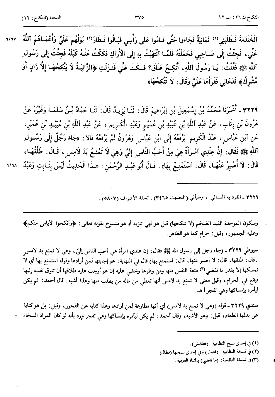 3229 - أَخْبَرَنَا مُحَمَّدُ بْنُ إِسْمَعِيلَ بْنِ إِبْرَاهِيمَ قَالَ حَدَّثَنَا يَزِيدُ قَالَ حَدَّثَنَا حَمَّادُ بْنُ سَلَمَةَ وَغَيْرُهُ عَنْ هَارُونَ بْنِ رِئَابٍ عَنْ عَبْدِ اللَّهِ بْنِ عُبَيْدِ بْنِ عُمَيْرٍ وَعَبْدِ الْكَرِيمِ عَنْ عَبْدِ اللَّهِ بْنِ عُبَيْدِ بْنِ عُمَيْرٍ عَنْ ابْنِ عَبَّاسٍ عَبْدُ الْكَرِيمِ يَرْفَعُهُ إِلَى ابْنِ عَبَّاسٍ وَهَارُونُ لَمْ يَرْفَعْهُ قَالَا جَاءَ رَجُلٌ إِلَى رَسُولِ اللَّهِ صَلَّى اللَّهُ عَلَيْهِ وَسَلَّمَ فَقَالَ إِنَّ عِنْدِي امْرَأَةً هِيَ مِنْ أَحَبِّ النَّاسِ إِلَيَّ وَهِيَ لَا تَمْنَعُ يَدَ لَامِسٍ قَالَ طَلِّقْهَا قَالَ لَا أَصْبِرُ عَنْهَا قَالَ اسْتَمْتِعْ بِهَا قَالَ أَبُو عَبْد الرَّحْمَنِ هَذَا الْحَدِيثُ لَيْسَ بِثَابِتٍ وَعَبْدُ الْكَرِيمِ لَيْسَ بِالْقَوِيِّ وَهَارُونُ بْنُ رِئَابٍ أَثْبَتُ مِنْهُ وَقَدْ أَرْسَلَ الْحَدِيثَ وَهَارُونُ ثِقَةٌ وَحَدِيثُهُ أَوْلَى بِالصَّوَابِ مِنْ حَدِيثِ عَبْدِ الْكَرِيمِ