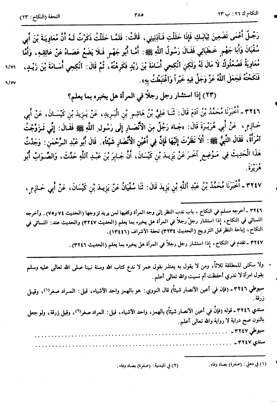 إِذَا اسْتَشَارَ رَجُلٌ رَجُلًا فِي الْمَرْأَةِ هَلْ يُخْبِرُهُ بِمَا يَعْلَمُ 3246 - أَخْبَرَنَا مُحَمَّدُ بْنُ آدَمَ قَالَ حَدَّثَنَا عَلِيُّ بْنُ هَاشِمِ بْنِ الْبَرِيدِ عَنْ يَزِيدَ بْنِ كَيْسَانَ عَنْ أَبِي حَازِمٍ عَنْ أَبِي هُرَيْرَةَ قَالَ جَاءَ رَجُلٌ مِنْ الْأَنْصَارِ إِلَى رَسُولِ اللَّهِ صَلَّى اللَّهُ عَلَيْهِ وَسَلَّمَ فَقَالَ إِنِّي تَزَوَّجْتُ امْرَأَةً فَقَالَ النَّبِيُّ صَلَّى اللَّهُ عَلَيْهِ وَسَلَّمَ أَلَا نَظَرْتَ إِلَيْهَا فَإِنَّ فِي أَعْيُنِ الْأَنْصَارِ شَيْئًا قَالَ أَبُو عَبْد الرَّحْمَنِ وَجَدْتُ هَذَا الْحَدِيثَ فِي مَوْضِعٍ آخَرَ عَنْ يَزِيدَ بْنِ كَيْسَانَ أَنَّ جَابِرَ بْنَ عَبْدِ اللَّهِ حَدَّثَ وَالصَّوَابُ أَبُو هُرَيْرَةَ