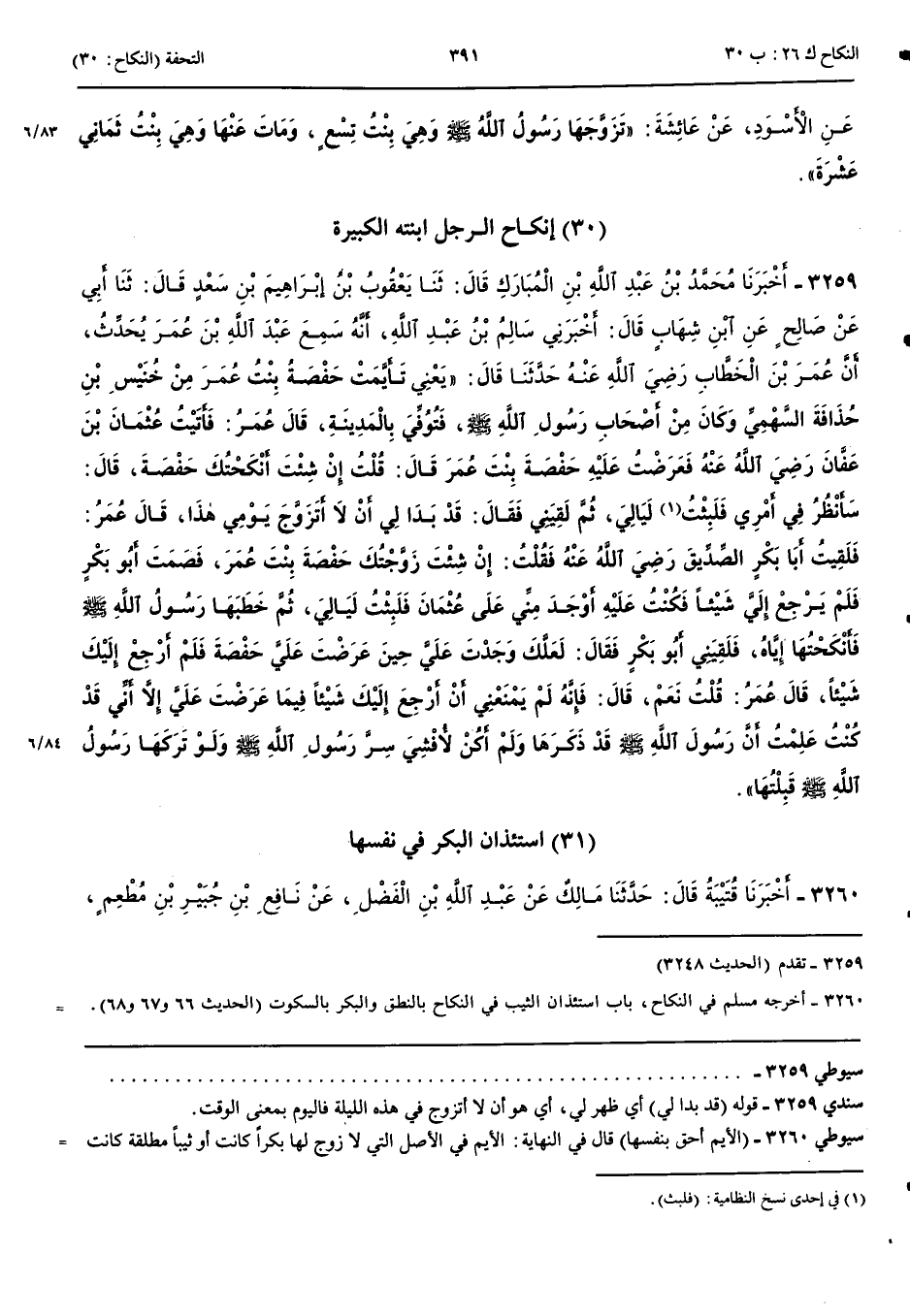 إِنْكَاحُ الرَّجُلِ ابْنَتَهُ الْكَبِيرَةَ 3259 - أَخْبَرَنَا مُحَمَّدُ بْنُ عَبْدِ اللَّهِ بْنِ الْمُبَارَكِ قَالَ حَدَّثَنَا يَعْقُوبُ بْنُ إِبْرَاهِيمَ بْنِ سَعْدٍ قَالَ حَدَّثَنَا أَبِي عَنْ صَالِحٍ عَنْ ابْنِ شِهَابٍ قَالَ أَخْبَرَنِي سَالِمُ بْنُ عَبْدِ اللَّهِ أَنَّهُ سَمِعَ عَبْدَ اللَّهِ بْنَ عُمَرَ يُحَدِّثُ أَنَّ عُمَرَ بْنَ الْخَطَّابِ رَضِيَ اللَّهُ عَنْهُ حَدَّثَنَا قَالَ يَعْنِي تَأَيَّمَتْ حَفْصَةُ بِنْتُ عُمَرَ مِنْ خُنَيْسِ بْنِ حُذَافَةَ السَّهْمِيِّ وَكَانَ مِنْ أَصْحَابِ رَسُولِ اللَّهِ صَلَّى اللَّهُ عَلَيْهِ وَسَلَّمَ فَتُوُفِّيَ بِالْمَدِينَةِ قَالَ عُمَرُ فَأَتَيْتُ عُثْمَانَ بْنَ عَفَّانَ رَضِيَ اللَّهُ عَنْهُ فَعَرَضْتُ عَلَيْهِ حَفْصَةَ بِنْتَ عُمَرَ قَالَ قُلْتُ إِنْ شِئْتَ أَنْكَحْتُكَ حَفْصَةَ قَالَ سَأَنْظُرُ فِي أَمْرِي فَلَبِثْتُ لَيَالِيَ ثُمَّ لَقِيَنِي فَقَالَ قَدْ بَدَا لِي أَنْ لَا أَتَزَوَّجَ يَوْمِي هَذَا قَالَ عُمَرُ فَلَقِيتُ أَبَا بَكْرٍ الصِّدِّيقَ رَضِيَ اللَّهُ عَنْهُ فَقُلْتُ إِنْ شِئْتَ زَوَّجْتُكَ حَفْصَةَ بِنْتَ عُمَرَ فَصَمَتَ أَبُو بَكْرٍ فَلَمْ يَرْجِعْ إِلَيَّ شَيْئًا فَكُنْتُ عَلَيْهِ أَوْجَدَ مِنِّي عَلَى عُثْمَانَ فَلَبِثْتُ لَيَالِيَ ثُمَّ خَطَبَهَا رَسُولُ اللَّهِ صَلَّى اللَّهُ عَلَيْهِ وَسَلَّمَ فَأَنْكَحْتُهَا إِيَّاهُ فَلَقِيَنِي أَبُو بَكْرٍ فَقَالَ لَعَلَّكَ وَجَدْتَ عَلَيَّ حِينَ عَرَضْتَ عَلَيَّ حَفْصَةَ فَلَمْ أَرْجِعْ إِلَيْكَ شَيْئًا قَالَ عُمَرُ قُلْتُ نَعَمْ قَالَ فَإِنَّهُ لَمْ يَمْنَعْنِي أَنْ أَرْجِعَ إِلَيْكَ شَيْئًا فِيمَا عَرَضْتَ عَلَيَّ إِلَّا أَنِّي قَدْ كُنْتُ عَلِمْتُ أَنَّ رَسُولَ اللَّهِ صَلَّى اللَّهُ عَلَيْهِ وَسَلَّمَ قَدْ ذَكَرَهَا وَلَمْ أَكُنْ لِأُفْشِيَ سِرَّ رَسُولِ اللَّهِ صَلَّى اللَّهُ عَلَيْهِ وَسَلَّمَ وَلَوْ تَرَكَهَا رَسُولُ اللَّهِ صَلَّى اللَّهُ عَلَيْهِ وَسَلَّمَ قَبِلْتُهَا
