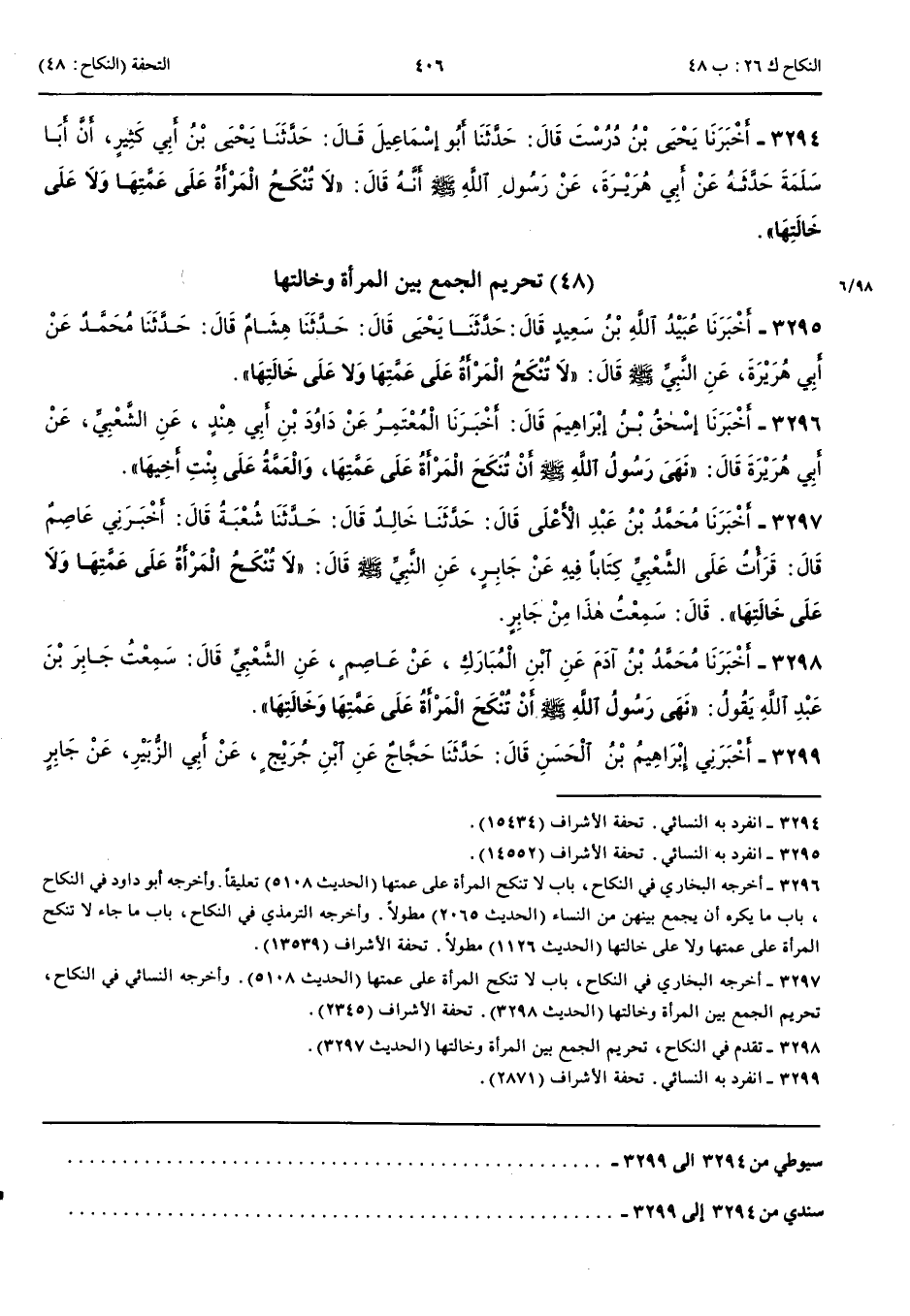 3294 - أَخْبَرَنَا يَحْيَى بْنُ دُرُسْتَ قَالَ حَدَّثَنَا أَبُو إِسْمَعِيلَ قَالَ حَدَّثَنَا يَحْيَى بْنُ أَبِي كَثِيرٍ أَنَّ أَبَا سَلَمَةَ حَدَّثَهُ عَنْ أَبِي هُرَيْرَةَ عَنْ رَسُولِ اللَّهِ صَلَّى اللَّهُ عَلَيْهِ وَسَلَّمَ أَنَّهُ قَالَ لَا تُنْكَحُ الْمَرْأَةُ عَلَى عَمَّتِهَا وَلَا عَلَى خَالَتِهَا