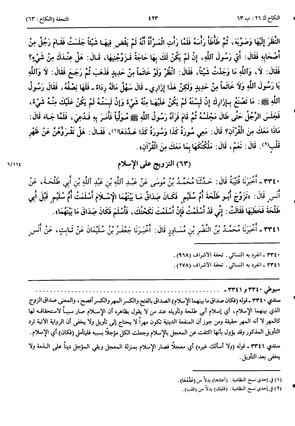 3341 - أَخْبَرَنَا مُحَمَّدُ بْنُ النَّضْرِ بْنِ مُسَاوِرٍ قَالَ أَنْبَأَنَا جَعْفَرُ بْنُ سُلَيْمَانَ عَنْ ثَابِتٍ عَنْ أَنَسٍ قَالَ خَطَبَ أَبُو طَلْحَةَ أُمَّ سُلَيْمٍ فَقَالَتْ وَاللَّهِ مَا مِثْلُكَ يَا أَبَا طَلْحَةَ يُرَدُّ وَلَكِنَّكَ رَجُلٌ كَافِرٌ وَأَنَا امْرَأَةٌ مُسْلِمَةٌ وَلَا يَحِلُّ لِي أَنْ أَتَزَوَّجَكَ فَإِنْ تُسْلِمْ فَذَاكَ مَهْرِي وَمَا أَسْأَلُكَ غَيْرَهُ فَأَسْلَمَ فَكَانَ ذَلِكَ مَهْرَهَا قَالَ ثَابِتٌ فَمَا سَمِعْتُ بِامْرَأَةٍ قَطُّ كَانَتْ أَكْرَمَ مَهْرًا مِنْ أُمِّ سُلَيْمٍ الْإِسْلَامَ فَدَخَلَ بِهَا فَوَلَدَتْ لَهُ