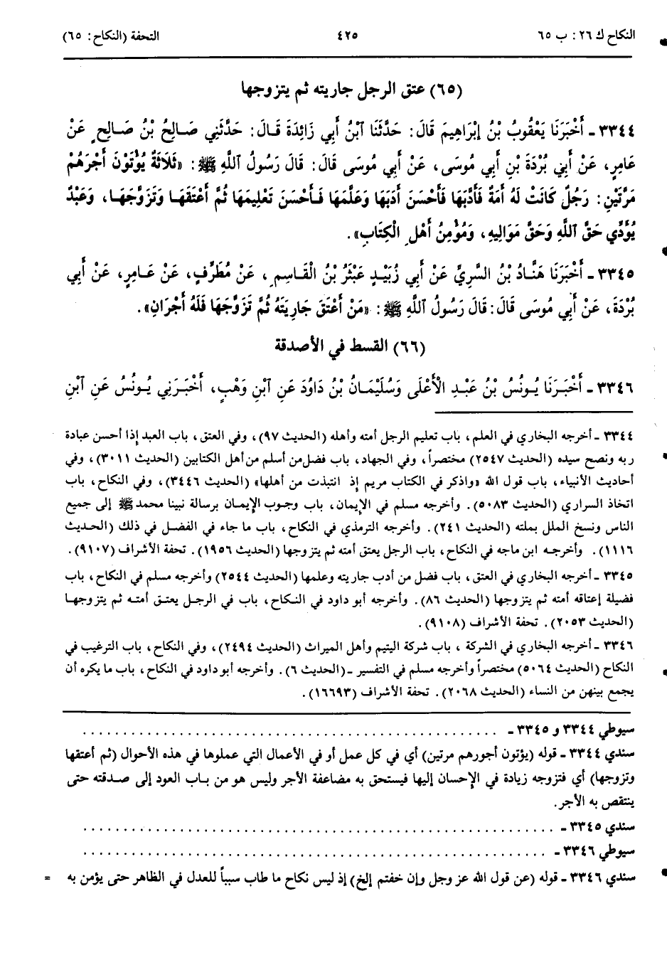 3345 - أَخْبَرَنَا هَنَّادُ بْنُ السَّرِيِّ عَنْ أَبِي زُبَيْدٍ عَبْثَرُ بْنُ الْقَاسِمِ عَنْ مُطَرِّفٍ عَنْ عَامِرٍ عَنْ أَبِي بُرْدَةَ عَنْ أَبِي مُوسَى قَالَ قَالَ رَسُولُ اللَّهِ صَلَّى اللَّهُ عَلَيْهِ وَسَلَّمَ مَنْ أَعْتَقَ جَارِيَتَهُ ثُمَّ تَزَوَّجَهَا فَلَهُ أَجْرَانِ