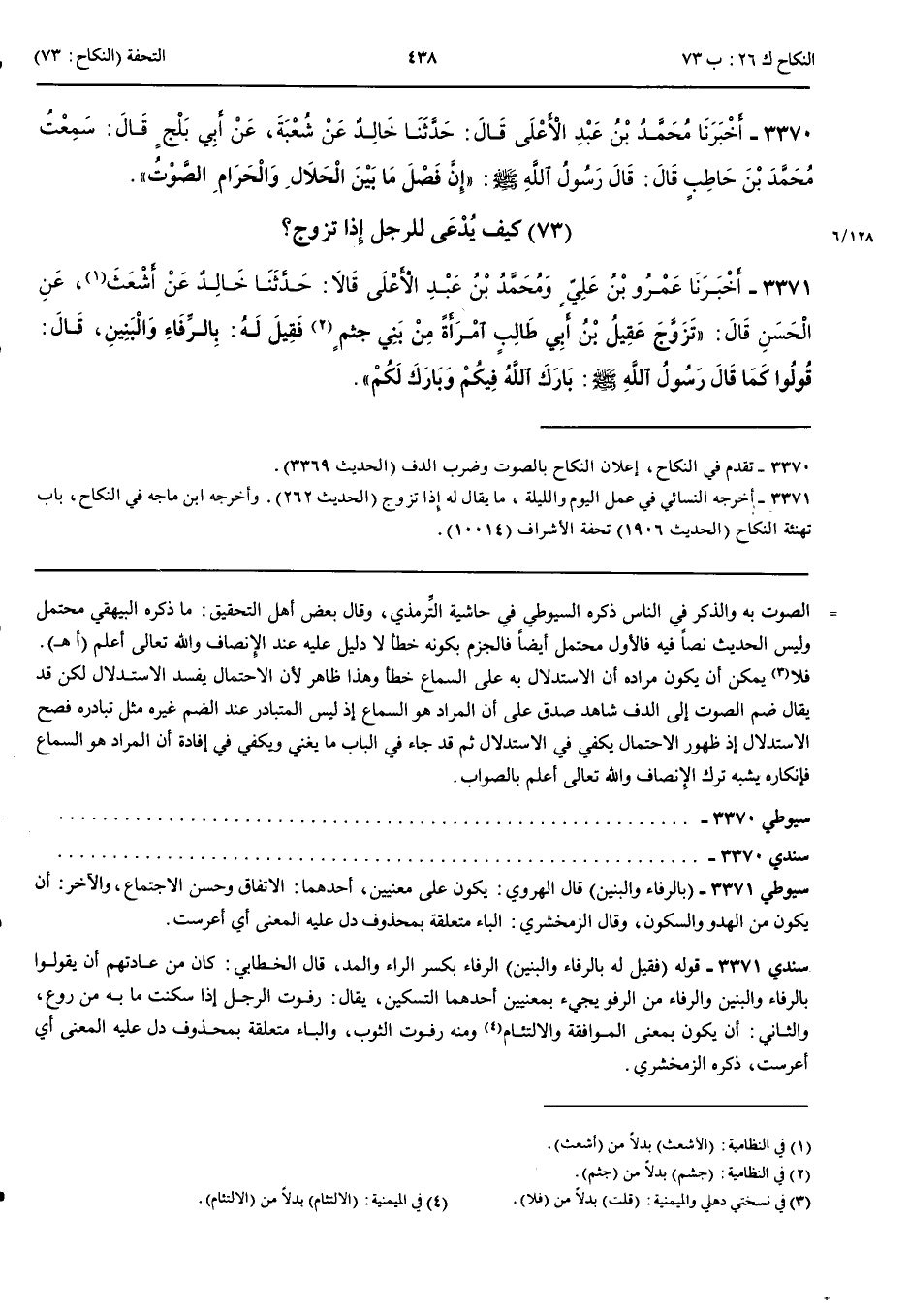 كَيْفَ يُدْعَى لِلرَّجُلِ إِذَا تَزَوَّجَ 3371 - حَدَّثَنَا عَمْرُو بْنُ عَلِيٍّ وَمُحَمَّدُ بْنُ عَبْدِ الْأَعْلَى قَالَا حَدَّثَنَا خَالِدٌ عَنْ أَشْعَثَ عَنْ الْحَسَنِ قَالَ تَزَوَّجَ عَقِيلُ بْنُ أَبِي طَالِبٍ امْرَأَةً مِنْ بَنِي جَثْمٍ فَقِيلَ لَهُ بِالرِّفَاءِ وَالْبَنِينَ قَالَ قُولُوا كَمَا قَالَ رَسُولُ اللَّهِ صَلَّى اللَّهُ عَلَيْهِ وَسَلَّمَ بَارَكَ اللَّهُ فِيكُمْ وَبَارَكَ لَكُمْ