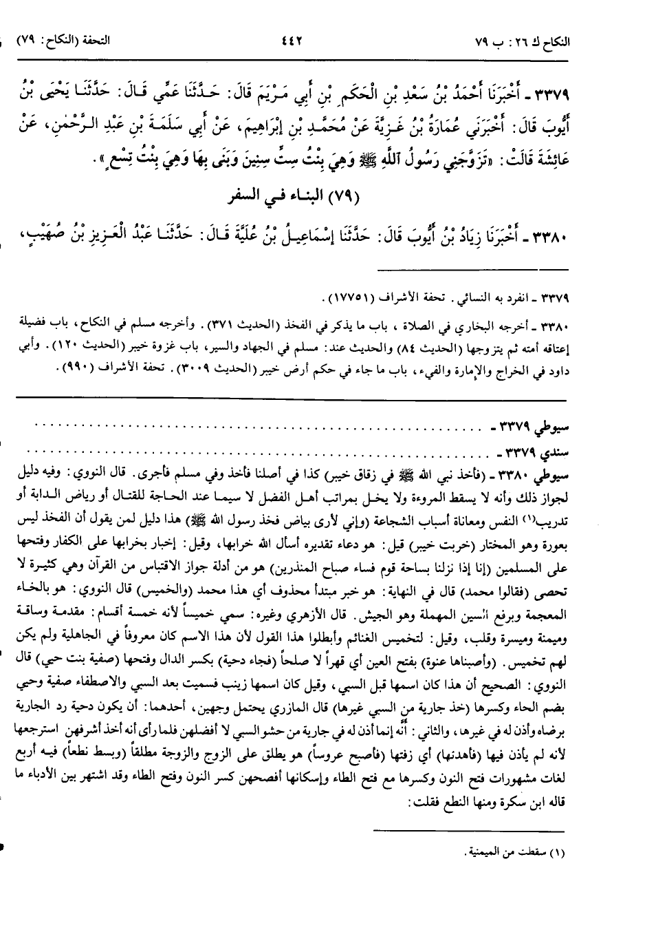3379 - أَخْبَرَنَا أَحْمَدُ بْنُ سَعْدِ بْنِ الْحَكَمِ بْنِ أَبِي مَرْيَمَ قَالَ حَدَّثَنَا عَمِّي قَالَ حَدَّثَنَا يَحْيَى بْنُ أَيُّوبَ قَالَ أَخْبَرَنِي عُمَارَةُ بْنُ غَزِيَّةَ عَنْ مُحَمَّدِ بْنِ إِبْرَاهِيمَ عَنْ أَبِي سَلَمَةَ بْنِ عَبْدِ الرَّحْمَنِ عَنْ عَائِشَةَ قَالَتْ تَزَوَّجَنِي رَسُولُ اللَّهِ صَلَّى اللَّهُ عَلَيْهِ وَسَلَّمَ وَهِيَ بِنْتُ سِتِّ سِنِينَ وَبَنَى بِهَا وَهِيَ بِنْتُ تِسْعٍ