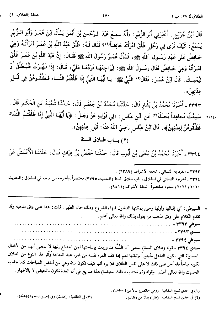 بَاب طَلَاقِ السُّنَّةِ 3394 - أَخْبَرَنَا مُحَمَّدُ بْنُ يَحْيَى بْنِ أَيُّوبَ قَالَ حَدَّثَنَا حَفْصُ بْنُ غِيَاثٍ قَالَ حَدَّثَنَا الْأَعْمَشُ عَنْ أَبِي إِسْحَقَ عَنْ أَبِي الْأَحْوَصِ عَنْ عَبْدِ اللَّهِ أَنَّهُ قَالَ طَلَاقُ السُّنَّةِ تَطْلِيقَةٌ وَهِيَ طَاهِرٌ فِي غَيْرِ جِمَاعٍ فَإِذَا حَاضَتْ وَطَهُرَتْ طَلَّقَهَا أُخْرَى فَإِذَا حَاضَتْ وَطَهُرَتْ طَلَّقَهَا أُخْرَى ثُمَّ تَعْتَدُّ بَعْدَ ذَلِكَ بِحَيْضَةٍ قَالَ الْأَعْمَشُ سَأَلْتُ إِبْرَاهِيمَ فَقَالَ مِثْلَ ذَلِكَ