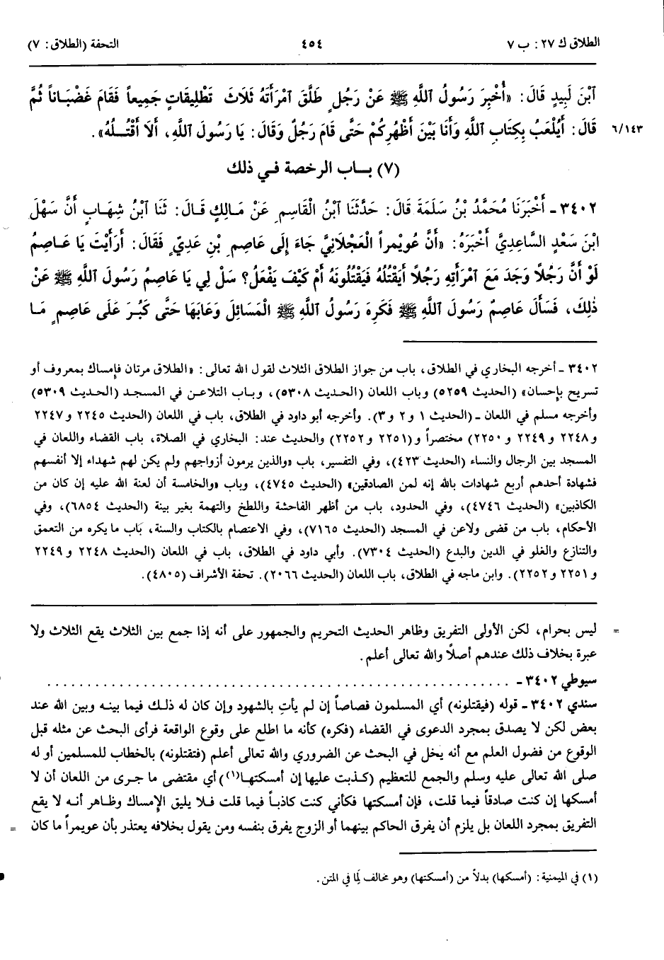 بَاب الرُّخْصَةِ فِي ذَلِكَ 3402 - أَخْبَرَنَا مُحَمَّدُ بْنُ سَلَمَةَ قَالَ حَدَّثَنَا ابْنُ الْقَاسِمِ عَنْ مَالِكٍ قَالَ حَدَّثَنِي ابْنُ شِهَابٍ أَنَّ سَهْلَ بْنَ سَعْدٍ السَّاعِدِيَّ أَخْبَرَهُ أَنَّ عُوَيْمِرًا الْعَجْلَانِيَّ جَاءَ إِلَى عَاصِمِ بْنِ عَدِيٍّ فَقَالَ أَرَأَيْتَ يَا عَاصِمُ لَوْ أَنَّ رَجُلًا وَجَدَ مَعَ امْرَأَتِهِ رَجُلًا أَيَقْتُلُهُ فَيَقْتُلُونَهُ أَمْ كَيْفَ يَفْعَلُ سَلْ لِي يَا عَاصِمُ رَسُولَ اللَّهِ صَلَّى اللَّهُ عَلَيْهِ وَسَلَّمَ عَنْ ذَلِكَ فَسَأَلَ عَاصِمٌ رَسُولَ اللَّهِ صَلَّى اللَّهُ عَلَيْهِ وَسَلَّمَ فَكَرِهَ رَسُولُ اللَّهِ صَلَّى اللَّهُ عَلَيْهِ وَسَلَّمَ الْمَسَائِلَ وَعَابَهَا حَتَّى كَبُرَ عَلَى عَاصِمٍ مَا سَمِعَ مِنْ رَسُولِ اللَّهِ صَلَّى اللَّهُ عَلَيْهِ وَسَلَّمَ فَلَمَّا رَجَعَ عَاصِمٌ إِلَى أَهْلِهِ جَاءَهُ عُوَيْمِرٌ فَقَالَ يَا عَاصِمُ مَاذَا قَالَ لَكَ رَسُولُ اللَّهِ صَلَّى اللَّهُ عَلَيْهِ وَسَلَّمَ فَقَالَ عَاصِمٌ لِعُوَيْمِرٍ لَمْ تَأْتِنِي بِخَيْرٍ قَدْ كَرِهَ رَسُولُ اللَّهِ صَلَّى اللَّهُ عَلَيْهِ وَسَلَّمَ الْمَسْأَلَةَ الَّتِي سَأَلْتَ عَنْهَا فَقَالَ عُوَيْمِرٌ وَاللَّهِ لَا أَنْتَهِي حَتَّى أَسْأَلَ عَنْهَا رَسُولَ اللَّهِ صَلَّى اللَّهُ عَلَيْهِ وَسَلَّمَ فَأَقْبَلَ عُوَيْمِرٌ حَتَّى أَتَى رَسُولَ اللَّهِ صَلَّى اللَّهُ عَلَيْهِ وَسَلَّمَ وَسْطَ النَّاسِ فَقَالَ يَا رَسُولَ اللَّهِ أَرَأَيْتَ رَجُلًا وَجَدَ مَعَ امْرَأَتِهِ رَجُلًا أَيَقْتُلُهُ فَتَقْتُلُونَهُ أَمْ كَيْفَ يَفْعَلُ فَقَالَ رَسُولُ اللَّهِ صَلَّى اللَّهُ عَلَيْهِ وَسَلَّمَ قَدْ نَزَلَ فِيكَ وَفِي صَاحِبَتِكَ فَاذْهَبْ فَأْتِ بِهَا قَالَ سَهْلٌ فَتَلَاعَنَا وَأَنَا مَعَ النَّاسِ عِنْدَ رَسُولِ اللَّهِ صَلَّى اللَّهُ عَلَيْهِ وَسَلَّمَ فَلَمَّا فَرَغَ عُوَيْمِرٌ قَالَ كَذَبْتُ عَلَيْهَا يَا رَسُولَ اللَّهِ إِنْ أَمْسَكْتُهَا فَطَلَّقَهَا ثَلَاثًا قَبْلَ أَنْ يَأْمُرَهُ رَسُولُ اللَّهِ صَلَّى اللَّهُ عَلَيْهِ وَسَلَّمَ