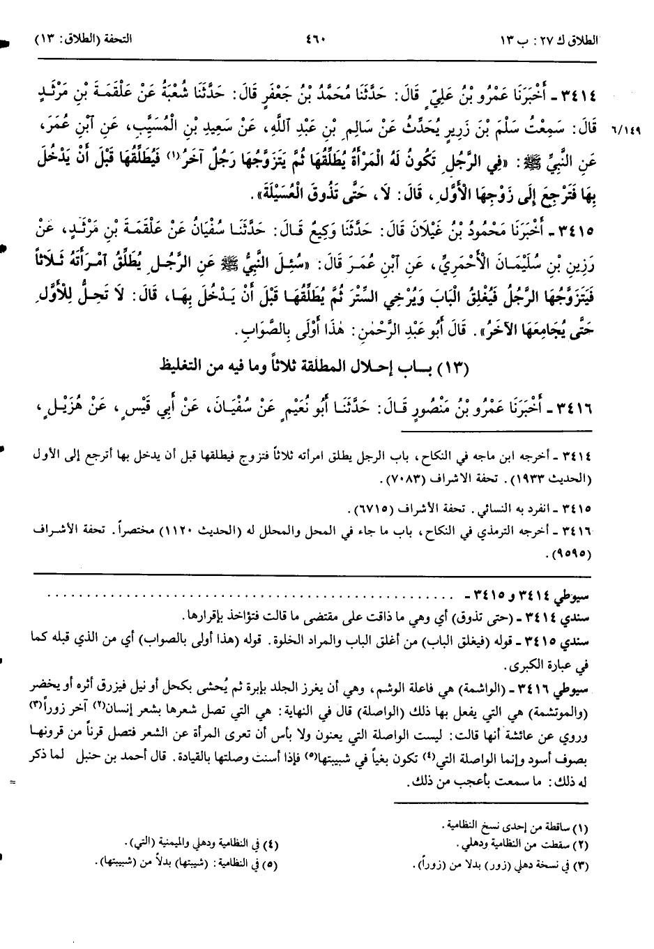 3415 - أَخْبَرَنَا مَحْمُودُ بْنُ غَيْلَانَ قَالَ حَدَّثَنَا وَكِيعٌ قَالَ حَدَّثَنَا سُفْيَانُ عَنْ عَلْقَمَةَ بْنِ مَرْثَدٍ عَنْ رَزِينِ بْنِ سُلَيْمَانَ الْأَحْمَرِيِّ عَنْ ابْنِ عُمَرَ قَالَ سُئِلَ النَّبِيُّ صَلَّى اللَّهُ عَلَيْهِ وَسَلَّمَ عَنْ الرَّجُلِ يُطَلِّقُ امْرَأَتَهُ ثَلَاثًا فَيَتَزَوَّجُهَا الرَّجُلُ فَيُغْلِقُ الْبَابَ وَيُرْخِي السِّتْرَ ثُمَّ يُطَلِّقُهَا قَبْلَ أَنْ يَدْخُلَ بِهَا قَالَ لَا تَحِلُّ لِلْأَوَّلِ حَتَّى يُجَامِعَهَا الْآخَرُ قَالَ أَبُو عَبْد الرَّحْمَنِ هَذَا أَوْلَى بِالصَّوَابِ