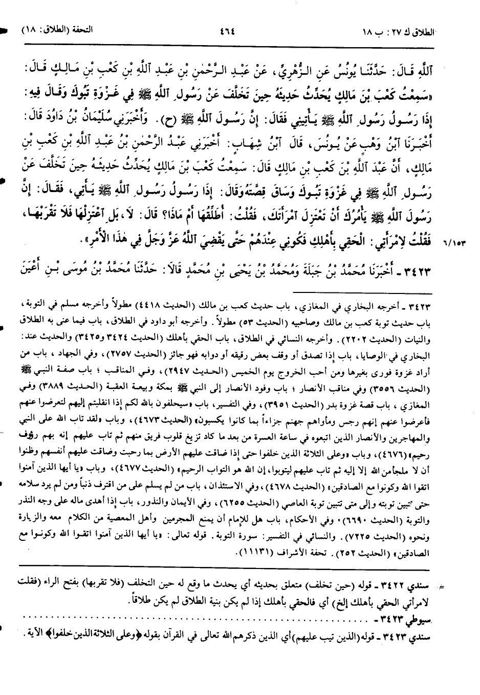 3423 - أَخْبَرَنِي مُحَمَّدُ بْنُ جَبَلَةَ وَمُحَمَّدُ بْنُ يَحْيَى بْنِ مُحَمَّدٍ قَالَا حَدَّثَنَا مُحَمَّدُ بْنُ مُوسَى بْنِ أَعْيَنَ قَالَ حَدَّثَنَا أَبِي عَنْ إِسْحَقَ بْنِ رَاشِدٍ عَنْ الزُّهْرِيِّ أَخْبَرَنِي عَبْدُ الرَّحْمَنِ بْنُ عَبْدِ اللَّهِ بْنِ كَعْبِ بْنِ مَالِكٍ عَنْ أَبِيهِ قَالَ سَمِعْتُ أَبِي كَعْبَ بْنَ مَالِكٍ قَالَ وَهُوَ أَحَدُ الثَّلَاثَةِ الَّذِينَ تِيبَ عَلَيْهِمْ يُحَدِّثُ قَالَ أَرْسَلَ إِلَيَّ رَسُولُ اللَّهِ صَلَّى اللَّهُ عَلَيْهِ وَسَلَّمَ وَإِلَى صَاحِبَيَّ أَنَّ رَسُولَ اللَّهِ صَلَّى اللَّهُ عَلَيْهِ وَسَلَّمَ يَأْمُرُكُمْ أَنْ تَعْتَزِلُوا نِسَاءَكُمْ فَقُلْتُ لِلرَّسُولِ أُطَلِّقُ امْرَأَتِي أَمْ مَاذَا أَفْعَلُ قَالَ لَا بَلْ تَعْتَزِلُهَا فَلَا تَقْرَبْهَا فَقُلْتُ لِامْرَأَتِي الْحَقِي بِأَهْلِكِ فَكُونِي فِيهِمْ فَلَحِقَتْ بِهِمْ