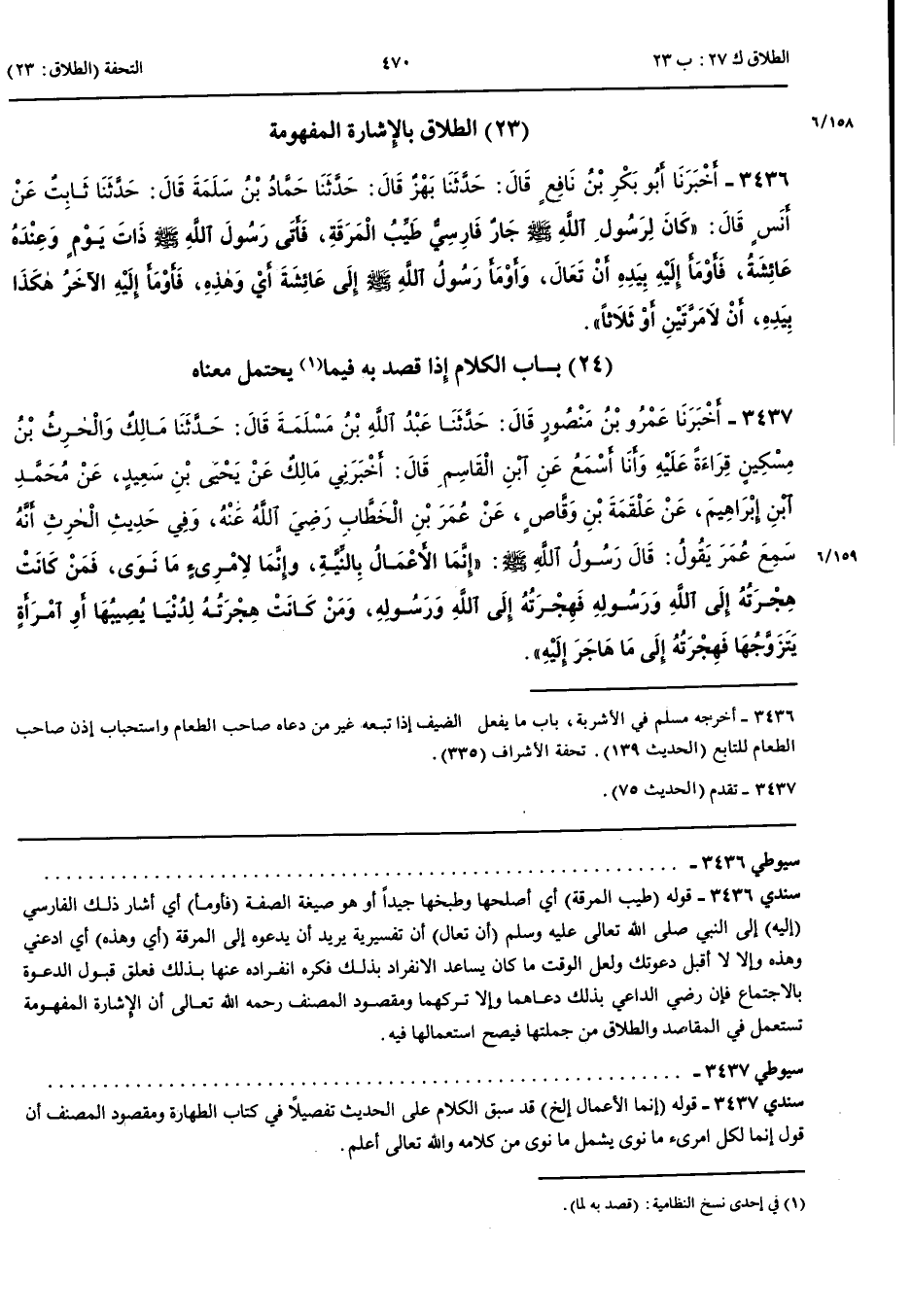 الطَّلَاقُ بِالْإِشَارَةِ الْمَفْهُومَةِ 3436 - أَخْبَرَنَا أَبُو بَكْرِ بْنُ نَافِعٍ قَالَ حَدَّثَنَا بَهْزٌ قَالَ حَدَّثَنَا حَمَّادُ بْنُ سَلَمَةَ قَالَ حَدَّثَنَا ثَابِتٌ عَنْ أَنَسٍ قَالَ كَانَ لِرَسُولِ اللَّهِ صَلَّى اللَّهُ عَلَيْهِ وَسَلَّمَ جَارٌ فَارِسِيٌّ طَيِّبُ الْمَرَقَةِ فَأَتَى رَسُولَ اللَّهِ صَلَّى اللَّهُ عَلَيْهِ وَسَلَّمَ ذَاتَ يَوْمٍ وَعِنْدَهُ عَائِشَةُ فَأَوْمَأَ إِلَيْهِ بِيَدِهِ أَنْ تَعَالَ وَأَوْمَأَ رَسُولُ اللَّهِ صَلَّى اللَّهُ عَلَيْهِ وَسَلَّمَ إِلَى عَائِشَةَ أَيْ وَهَذِهِ فَأَوْمَأَ إِلَيْهِ الْآخَرُ هَكَذَا بِيَدِهِ أَنْ لَا مَرَّتَيْنِ أَوْ ثَلَاثًا