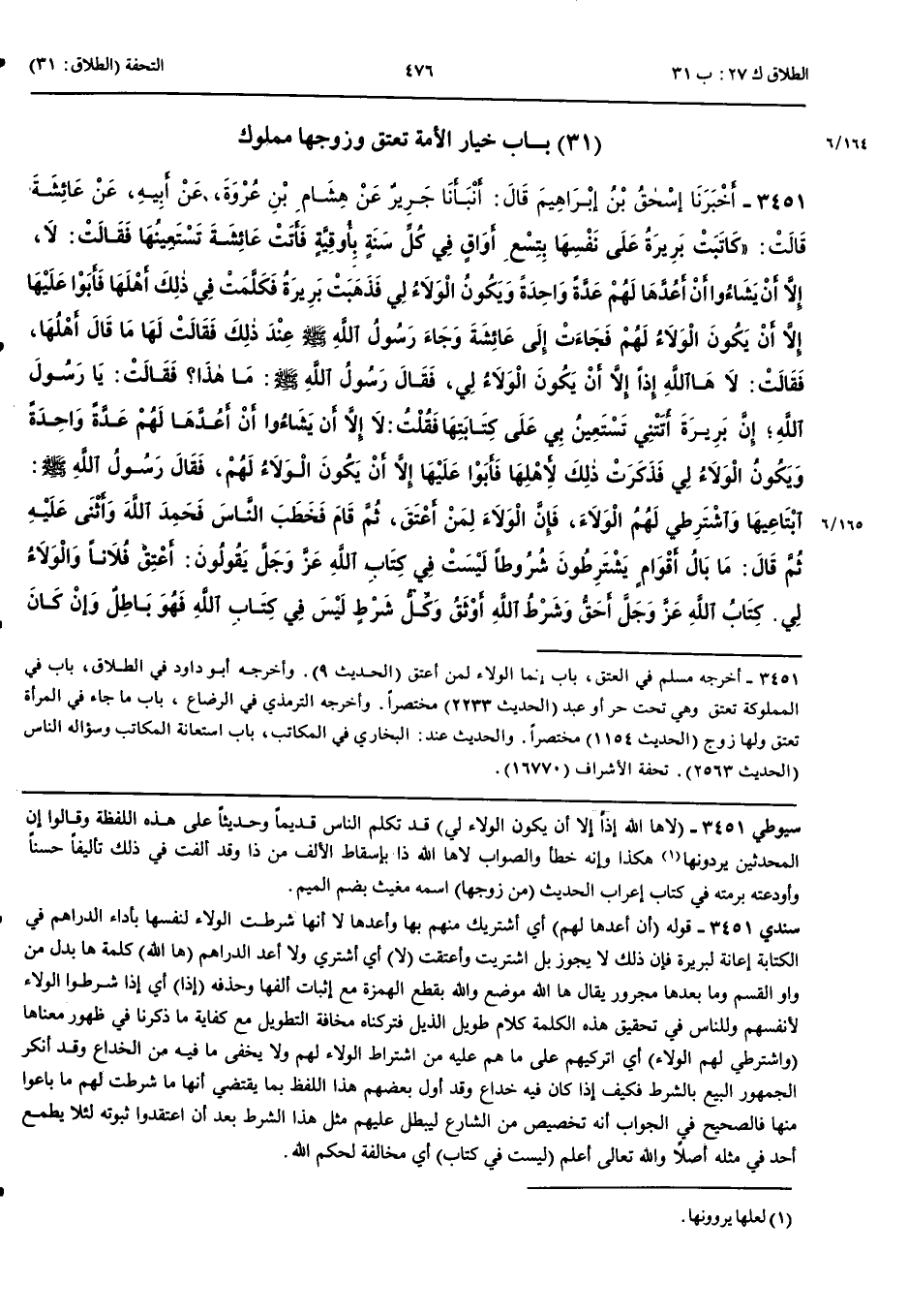 3451 - أَخْبَرَنَا إِسْحَقُ بْنُ إِبْرَاهِيمَ قَالَ أَنْبَأَنَا جَرِيرٌ عَنْ هِشَامِ بْنِ عُرْوَةَ عَنْ أَبِيهِ عَنْ عَائِشَةَ قَالَتْ كَاتَبَتْ بَرِيرَةُ عَلَى نَفْسِهَا بِتِسْعِ أَوَاقٍ فِي كُلِّ سَنَةٍ بِأُوقِيَّةٍ فَأَتَتْ عَائِشَةَ تَسْتَعِينُهَا فَقَالَتْ لَا إِلَّا أَنْ يَشَاءُوا أَنْ أَعُدَّهَا لَهُمْ عَدَّةً وَاحِدَةً وَيَكُونُ الْوَلَاءُ لِي فَذَهَبَتْ بَرِيرَةُ فَكَلَّمَتْ فِي ذَلِكَ أَهْلَهَا فَأَبَوْا عَلَيْهَا إِلَّا أَنْ يَكُونَ الْوَلَاءُ لَهُمْ فَجَاءَتْ إِلَى عَائِشَةَ وَجَاءَ رَسُولُ اللَّهِ صَلَّى اللَّهُ عَلَيْهِ وَسَلَّمَ عِنْدَ ذَلِكَ فَقَالَتْ لَهَا مَا قَالَ أَهْلُهَا فَقَالَتْ لَا هَا اللَّهِ إِذًا إِلَّا أَنْ يَكُونَ الْوَلَاءُ لِي فَقَالَ رَسُولُ اللَّهِ صَلَّى اللَّهُ عَلَيْهِ وَسَلَّمَ مَا هَذَا فَقَالَتْ يَا رَسُولَ اللَّهِ إِنَّ بَرِيرَةَ أَتَتْنِي تَسْتَعِينُ بِي عَلَى كِتَابَتِهَا فَقُلْتُ لَا إِلَّا أَنْ يَشَاءُوا أَنْ أَعُدَّهَا لَهُمْ عَدَّةً وَاحِدَةً وَيَكُونُ الْوَلَاءُ لِي فَذَكَرَتْ ذَلِكَ لِأَهْلِهَا فَأَبَوْا عَلَيْهَا إِلَّا أَنْ يَكُونَ الْوَلَاءُ لَهُمْ فَقَالَ رَسُولُ اللَّهِ صَلَّى اللَّهُ عَلَيْهِ وَسَلَّمَ ابْتَاعِيهَا وَاشْتَرِطِي لَهُمْ الْوَلَاءَ فَإِنَّ الْوَلَاءَ لِمَنْ أَعْتَقَ ثُمَّ قَامَ فَخَطَبَ النَّاسَ فَحَمِدَ اللَّهَ وَأَثْنَى عَلَيْهِ ثُمَّ قَالَ مَا بَالُ أَقْوَامٍ يَشْتَرِطُونَ شُرُوطًا لَيْسَتْ فِي كِتَابِ اللَّهِ عَزَّ وَجَلَّ يَقُولُونَ أَعْتِقْ فُلَانًا وَالْوَلَاءُ لِي كِتَابُ اللَّهِ عَزَّ وَجَلَّ أَحَقُّ وَشَرْطُ اللَّهِ أَوْثَقُ وَكُلُّ شَرْطٍ لَيْسَ فِي كِتَابِ اللَّهِ فَهُوَ بَاطِلٌ وَإِنْ كَانَ مِائَةَ شَرْطٍ فَخَيَّرَهَا رَسُولُ اللَّهِ صَلَّى اللَّهُ عَلَيْهِ وَسَلَّمَ مِنْ زَوْجِهَا وَكَانَ عَبْدًا فَاخْتَارَتْ نَفْسَهَا قَالَ عُرْوَةُ فَلَوْ كَانَ حُرًّا مَا خَيَّرَهَا رَسُولُ اللَّهِ صَلَّى اللَّهُ عَلَيْهِ وَسَلَّمَ