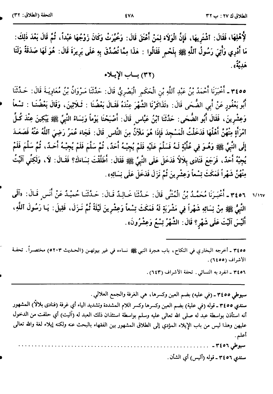 بَاب الْإِيلَاءِ 3455 - أَخْبَرَنَا أَحْمَدُ بْنُ عَبْدِ اللَّهِ بْنِ الْحَكَمِ الْبَصْرِيُّ قَالَ حَدَّثَنَا مَرْوَانُ بْنُ مُعَاوِيَةَ قَالَ حَدَّثَنَا أَبُو يَعْفُورٍ عَنْ أَبِي الضُّحَى قَالَ تَذَاكَرْنَا الشَّهْرَ عِنْدَهُ فَقَالَ بَعْضُنَا ثَلَاثِينَ وَقَالَ بَعْضُنَا تِسْعًا وَعِشْرِينَ فَقَالَ أَبُو الضُّحَى حَدَّثَنَا ابْنُ عَبَّاسٍ قَالَ أَصْبَحْنَا يَوْمًا وَنِسَاءُ النَّبِيِّ صَلَّى اللَّهُ عَلَيْهِ وَسَلَّمَ يَبْكِينَ عِنْدَ كُلِّ امْرَأَةٍ مِنْهُنَّ أَهْلُهَا فَدَخَلْتُ الْمَسْجِدَ فَإِذَا هُوَ مَلْآنٌ مِنْ النَّاسِ قَالَ فَجَاءَ عُمَرُ رَضِيَ اللَّهُ عَنْهُ فَصَعِدَ إِلَى النَّبِيِّ صَلَّى اللَّهُ عَلَيْهِ وَسَلَّمَ وَهُوَ فِي عُلِّيَّةٍ لَهُ فَسَلَّمَ عَلَيْهِ فَلَمْ يُجِبْهُ أَحَدٌ ثُمَّ سَلَّمَ فَلَمْ يُجِبْهُ أَحَدٌ ثُمَّ سَلَّمَ فَلَمْ يُجِبْهُ أَحَدٌ فَرَجَعَ فَنَادَى بِلَالًا فَدَخَلَ عَلَى النَّبِيِّ صَلَّى اللَّهُ عَلَيْهِ وَسَلَّمَ فَقَالَ أَطَلَّقْتَ نِسَاءَكَ فَقَالَ لَا وَلَكِنِّي آلَيْتُ مِنْهُنَّ شَهْرًا فَمَكَثَ تِسْعًا وَعِشْرِينَ ثُمَّ نَزَلَ فَدَخَلَ عَلَى نِسَائِهِ