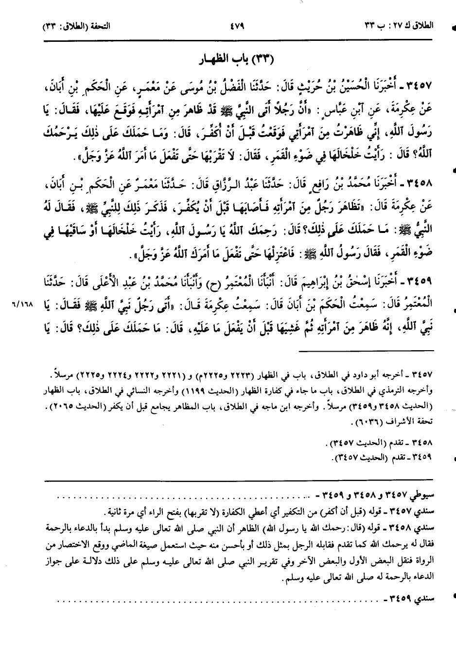 3458 - أَخْبَرَنَا مُحَمَّدُ بْنُ رَافِعٍ قَالَ حَدَّثَنَا عَبْدُ الرَّزَّاقِ قَالَ حَدَّثَنَا مَعْمَرٌ عَنْ الْحَكَمِ بْنِ أَبَانَ عَنْ عِكْرِمَةَ قَالَ تَظَاهَرَ رَجُلٌ مِنْ امْرَأَتِهِ فَأَصَابَهَا قَبْلَ أَنْ يُكَفِّرَ فَذَكَرَ ذَلِكَ لِلنَّبِيِّ صَلَّى اللَّهُ عَلَيْهِ وَسَلَّمَ فَقَالَ لَهُ النَّبِيُّ صَلَّى اللَّهُ عَلَيْهِ وَسَلَّمَ مَا حَمَلَكَ عَلَى ذَلِكَ قَالَ رَحِمَكَ اللَّهُ يَا رَسُولَ اللَّهِ رَأَيْتُ خَلْخَالَهَا أَوْ سَاقَيْهَا فِي ضَوْءِ الْقَمَرِ فَقَالَ رَسُولُ اللَّهِ صَلَّى اللَّهُ عَلَيْهِ وَسَلَّمَ فَاعْتَزِلْهَا حَتَّى تَفْعَلَ مَا أَمَرَكَ اللَّهُ عَزَّ وَجَلَّ