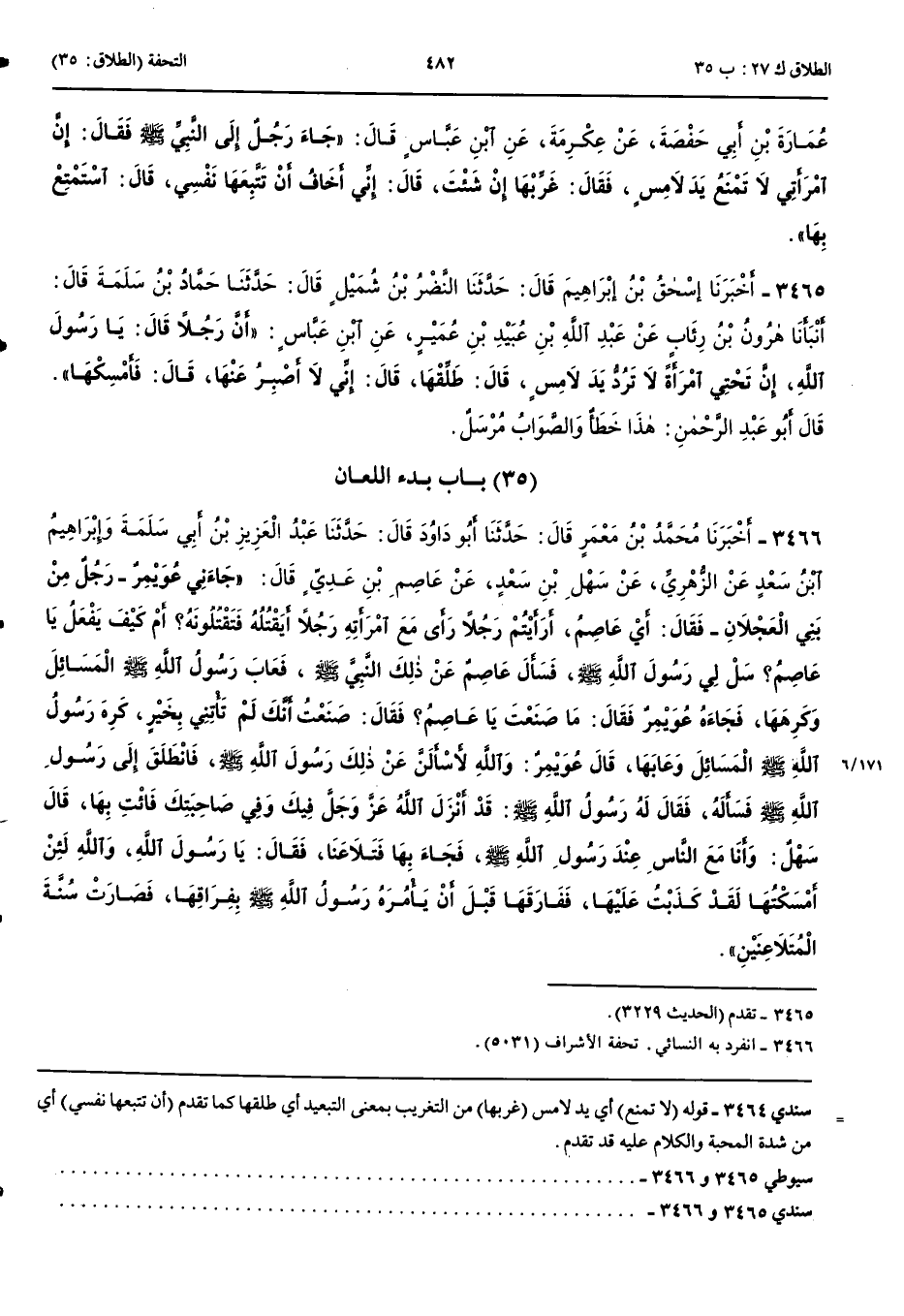 بَاب بَدْءِ اللِّعَانِ 3466 - أَخْبَرَنَا مُحَمَّدُ بْنُ مَعْمَرٍ قَالَ حَدَّثَنَا أَبُو دَاوُدَ قَالَ حَدَّثَنَا عَبْدُ الْعَزِيزِ بْنُ أَبِي سَلَمَةَ وَإِبْرَاهِيمُ بْنُ سَعْدٍ عَنْ الزُّهْرِيِّ عَنْ سَهْلِ بْنِ سَعْدٍ عَنْ عَاصِمِ بْنِ عَدِيٍّ قَالَ جَاءَنِي عُوَيْمِرٌ رَجُلٌ مِنْ بَنِي الْعَجْلَانِ فَقَالَ أَيْ عَاصِمُ أَرَأَيْتُمْ رَجُلًا رَأَى مَعَ امْرَأَتِهِ رَجُلًا أَيَقْتُلُهُ فَتَقْتُلُونَهُ أَمْ كَيْفَ يَفْعَلُ يَا عَاصِمُ سَلْ لِي رَسُولَ اللَّهِ صَلَّى اللَّهُ عَلَيْهِ وَسَلَّمَ فَسَأَلَ عَاصِمٌ عَنْ ذَلِكَ النَّبِيَّ صَلَّى اللَّهُ عَلَيْهِ وَسَلَّمَ فَعَابَ رَسُولُ اللَّهِ صَلَّى اللَّهُ عَلَيْهِ وَسَلَّمَ الْمَسَائِلَ وَكَرِهَهَا فَجَاءَهُ عُوَيْمِرٌ فَقَالَ مَا صَنَعْتَ يَا عَاصِمُ فَقَالَ صَنَعْتُ أَنَّكَ لَمْ تَأْتِنِي بِخَيْرٍ كَرِهَ رَسُولُ اللَّهِ صَلَّى اللَّهُ عَلَيْهِ وَسَلَّمَ الْمَسَائِلَ وَعَابَهَا قَالَ عُوَيْمِرٌ وَاللَّهِ لَأَسْأَلَنَّ عَنْ ذَلِكَ رَسُولَ اللَّهِ صَلَّى اللَّهُ عَلَيْهِ وَسَلَّمَ فَانْطَلَقَ إِلَى رَسُولِ اللَّهِ صَلَّى اللَّهُ عَلَيْهِ وَسَلَّمَ فَسَأَلَهُ فَقَالَ لَهُ رَسُولُ اللَّهِ صَلَّى اللَّهُ عَلَيْهِ وَسَلَّمَ قَدْ أَنْزَلَ اللَّهُ عَزَّ وَجَلَّ فِيكَ وَفِي صَاحِبَتِكَ فَأْتِ بِهَا قَالَ سَهْلٌ وَأَنَا مَعَ النَّاسِ عِنْدَ رَسُولِ اللَّهِ صَلَّى اللَّهُ عَلَيْهِ وَسَلَّمَ فَجَاءَ بِهَا فَتَلَاعَنَا فَقَالَ يَا رَسُولَ اللَّهِ وَاللَّهِ لَئِنْ أَمْسَكْتُهَا لَقَدْ كَذَبْتُ عَلَيْهَا فَفَارَقَهَا قَبْلَ أَنْ يَأْمُرَهُ رَسُولُ اللَّهِ صَلَّى اللَّهُ عَلَيْهِ وَسَلَّمَ بِفِرَاقِهَا فَصَارَتْ سُنَّةَ الْمُتَلَاعِنَيْنِ