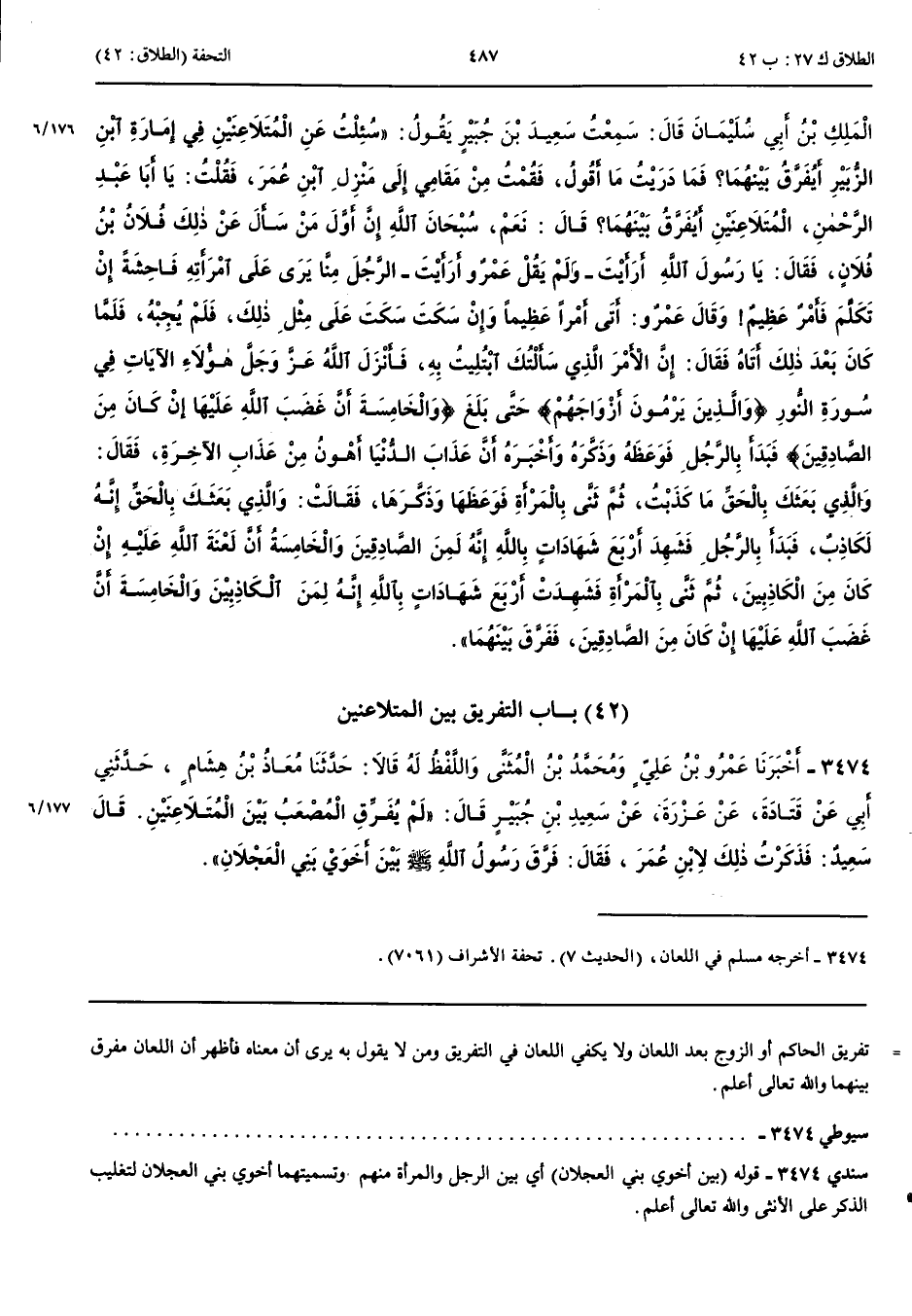 بَاب التَّفْرِيقِ بَيْنَ الْمُتَلَاعِنَيْنِ 3474 - أَخْبَرَنَا عَمْرُو بْنُ عَلِيٍّ وَمُحَمَّدُ بْنُ الْمُثَنَّى وَاللَّفْظُ لَهُ قَالَا حَدَّثَنَا مُعَاذُ بْنُ هِشَامٍ حَدَّثَنِي أَبِي عَنْ قَتَادَةَ عَنْ عَزْرَةَ عَنْ سَعِيدِ بْنِ جُبَيْرٍ قَالَ لَمْ يُفَرِّقْ الْمُصْعَبُ بَيْنَ الْمُتَلَاعِنَيْنِ قَالَ سَعِيدٌ فَذَكَرْتُ ذَلِكَ لِابْنِ عُمَرَ فَقَالَ فَرَّقَ رَسُولُ اللَّهِ صَلَّى اللَّهُ عَلَيْهِ وَسَلَّمَ بَيْنَ أَخَوَيْ بَنِي الْعَجْلَانِ