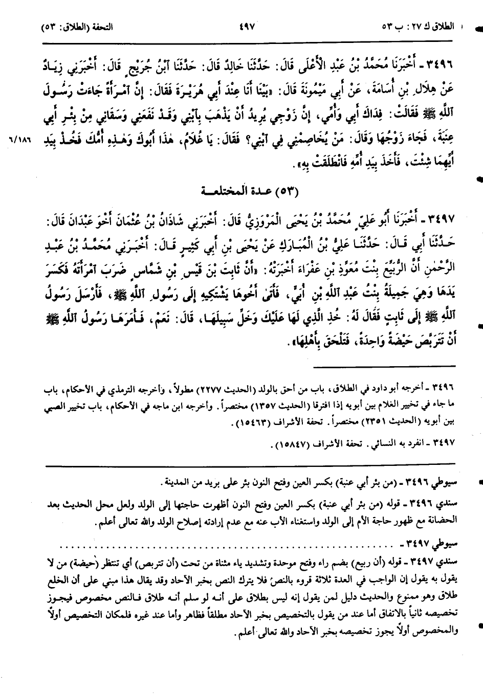 عِدَّةُ الْمُخْتَلِعَةِ 3497 - أَخْبَرَنَا أَبُو عَلِيٍّ مُحَمَّدُ بْنُ يَحْيَى الْمَرْوَزِيُّ قَالَ أَخْبَرَنِي شَاذَانُ بْنُ عُثْمَانَ أَخُو عَبْدَانَ قَالَ حَدَّثَنَا أَبِي قَالَ حَدَّثَنَا عَلِيُّ بْنُ الْمُبَارَكِ عَنْ يَحْيَى بْنِ أَبِي كَثِيرٍ قَالَ أَخْبَرَنِي مُحَمَّدُ بْنُ عَبْدِ الرَّحْمَنِ أَنَّ الرُّبَيِّعَ بِنْتَ مُعَوِّذِ بْنِ عَفْرَاءَ أَخْبَرَتْهُ أَنَّ ثَابِتَ بْنَ قَيْسِ بْنِ شَمَّاسٍ ضَرَبَ امْرَأَتَهُ فَكَسَرَ يَدَهَا وَهِيَ جَمِيلَةُ بِنْتُ عَبْدِ اللَّهِ بْنِ أُبَيٍّ فَأَتَى أَخُوهَا يَشْتَكِيهِ إِلَى رَسُولِ اللَّهِ صَلَّى اللَّهُ عَلَيْهِ وَسَلَّمَ فَأَرْسَلَ رَسُولُ اللَّهِ صَلَّى اللَّهُ عَلَيْهِ وَسَلَّمَ إِلَى ثَابِتٍ فَقَالَ لَهُ خُذْ الَّذِي لَهَا عَلَيْكَ وَخَلِّ سَبِيلَهَا قَالَ نَعَمْ فَأَمَرَهَا رَسُولُ اللَّهِ صَلَّى اللَّهُ عَلَيْهِ وَسَلَّمَ أَنْ تَتَرَبَّصَ حَيْضَةً وَاحِدَةً فَتَلْحَقَ بِأَهْلِهَا