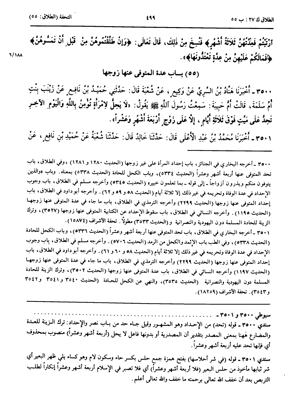 بَاب عِدَّةِ الْمُتَوَفَّى عَنْهَا زَوْجُهَا 3500 - أَخْبَرَنَا هَنَّادُ بْنُ السَّرِيِّ عَنْ وَكِيعٍ عَنْ شُعْبَةَ قَالَ حَدَّثَنِي حُمَيْدُ بْنُ نَافِعٍ عَنْ زَيْنَبَ بِنْتِ أُمِّ سَلَمَةَ قَالَتْ أُمُّ حَبِيبَةَ سَمِعْتُ رَسُولَ اللَّهِ صَلَّى اللَّهُ عَلَيْهِ وَسَلَّمَ يَقُولُ لَا يَحِلُّ لِامْرَأَةٍ تُؤْمِنُ بِاللَّهِ وَالْيَوْمِ الْآخِرِ تَحِدُّ عَلَى مَيِّتٍ فَوْقَ ثَلَاثَةِ أَيَّامٍ إِلَّا عَلَى زَوْجٍ أَرْبَعَةَ أَشْهُرٍ وَعَشْرًا