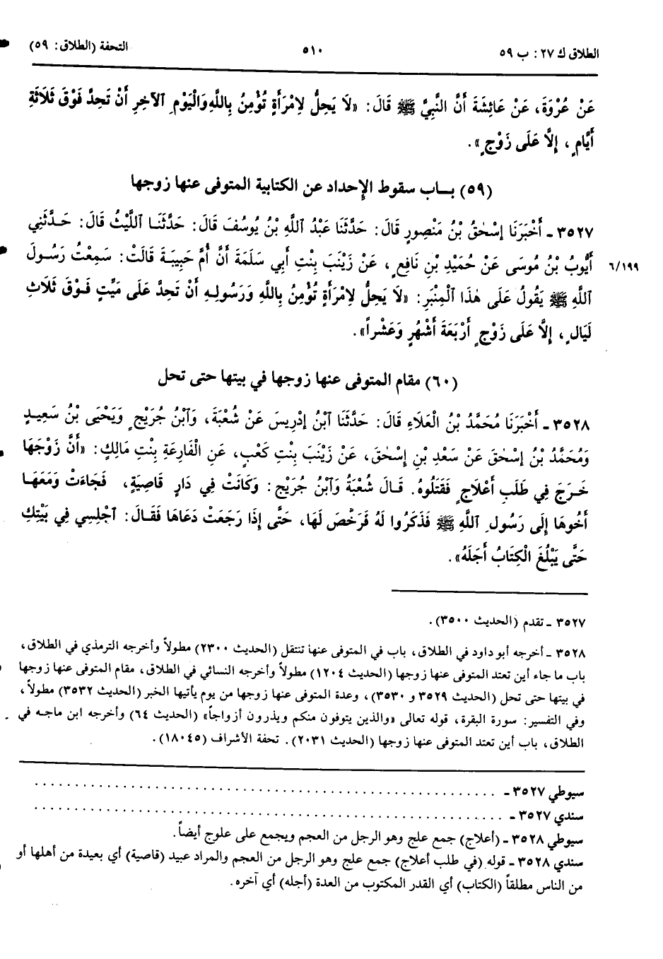 مَقَامُ الْمُتَوَفَّى عَنْهَا زَوْجُهَا فِي بَيْتِهَا حَتَّى تَحِلَّ 3528 - أَخْبَرَنَا مُحَمَّدُ بْنُ الْعَلَاءِ قَالَ حَدَّثَنَا ابْنُ إِدْرِيسَ عَنْ شُعْبَةَ وَابْنُ جُرَيْجٍ وَيَحْيَى بْنُ سَعِيدٍ وَمُحَمَّدُ بْنُ إِسْحَقَ عَنْ سَعْدِ بْنِ إِسْحَقَ عَنْ زَيْنَبَ بِنْتِ كَعْبٍ عَنْ الْفَارِعَةِ بِنْتِ مَالِكٍ أَنَّ زَوْجَهَا خَرَجَ فِي طَلَبِ أَعْلَاجٍ فَقَتَلُوهُ قَالَ شُعْبَةُ وَابْنُ جُرَيْجٍ وَكَانَتْ فِي دَارٍ قَاصِيَةٍ فَجَاءَتْ وَمَعَهَا أَخُوهَا إِلَى رَسُولِ اللَّهِ صَلَّى اللَّهُ عَلَيْهِ وَسَلَّمَ فَذَكَرُوا لَهُ فَرَخَّصَ لَهَا حَتَّى إِذَا رَجَعَتْ دَعَاهَا فَقَالَ اجْلِسِي فِي بَيْتِكِ حَتَّى يَبْلُغَ الْكِتَابُ أَجَلَهُ