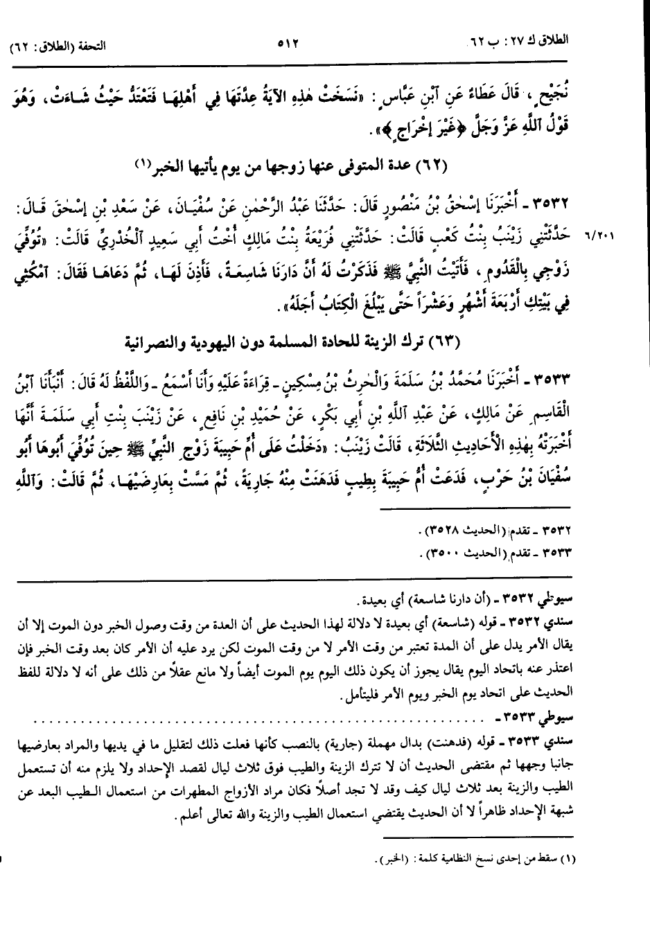 تَرْكُ الزِّينَةِ لِلْحَادَّةِ الْمُسْلِمَةِ دُونَ الْيَهُودِيَّةِ وَالنَّصْرَانِيَّةِ 3533 - أَخْبَرَنَا مُحَمَّدُ بْنُ سَلَمَةَ وَالْحَارِثُ بْنُ مِسْكِينٍ قِرَاءَةً عَلَيْهِ وَأَنَا أَسْمَعُ وَاللَّفْظُ لَهُ قَالَ أَنْبَأَنَا ابْنُ الْقَاسِمِ عَنْ مَالِكٍ عَنْ عَبْدِ اللَّهِ بْنِ أَبِي بَكْرٍ عَنْ حُمَيْدِ بْنِ نَافِعٍ عَنْ زَيْنَبَ بِنْتِ أَبِي سَلَمَةَ أَنَّهَا أَخْبَرَتْهُ بِهَذِهِ الْأَحَادِيثِ الثَّلَاثَةِ قَالَتْ زَيْنَبُ دَخَلْتُ عَلَى أُمِّ حَبِيبَةَ زَوْجِ النَّبِيِّ صَلَّى اللَّهُ عَلَيْهِ وَسَلَّمَ حِينَ تُوُفِّيَ أَبُوهَا أَبُو سُفْيَانَ بْنُ حَرْبٍ فَدَعَتْ أُمُّ حَبِيبَةَ بِطِيبٍ فَدَهَنَتْ مِنْهُ جَارِيَةً ثُمَّ مَسَّتْ بِعَارِضَيْهَا ثُمَّ قَالَتْ وَاللَّهِ مَا لِي بِالطِّيبِ مِنْ حَاجَةٍ غَيْرَ أَنِّي سَمِعْتُ رَسُولَ اللَّهِ صَلَّى اللَّهُ عَلَيْهِ وَسَلَّمَ قَالَ لَا يَحِلُّ لِامْرَأَةٍ تُؤْمِنُ بِاللَّهِ وَالْيَوْمِ الْآخِرِ تَحِدُّ عَلَى مَيِّتٍ فَوْقَ ثَلَاثِ لَيَالٍ إِلَّا عَلَى زَوْجٍ أَرْبَعَةَ أَشْهُرٍ وَعَشْرًا
