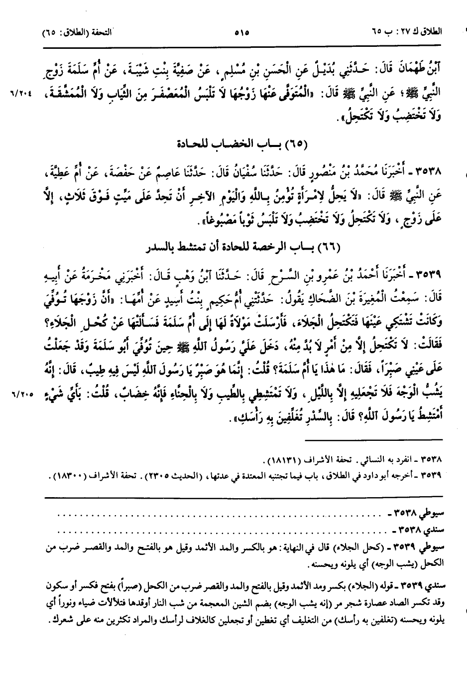 بَاب الرُّخْصَةِ لِلْحَادَّةِ أَنْ تَمْتَشِطَ بِالسِّدْرِ 3539 - أَخْبَرَنَا أَحْمَدُ بْنُ عَمْرِو بْنِ السَّرْحِ قَالَ حَدَّثَنَا ابْنُ وَهْبٍ قَالَ أَخْبَرَنِي مَخْرَمَةُ عَنْ أَبِيهِ قَالَ سَمِعْتُ الْمُغِيرَةَ بْنَ الضَّحَّاكِ يَقُولُ حَدَّثَتْنِي أُمُّ حَكِيمٍ بِنْتُ أَسِيدٍ عَنْ أُمِّهَا أَنَّ زَوْجَهَا تُوُفِّيَ وَكَانَتْ تَشْتَكِي عَيْنَهَا فَتَكْتَحِلُ الْجَلَاءَ فَأَرْسَلَتْ مَوْلَاةً لَهَا إِلَى أُمِّ سَلَمَةَ فَسَأَلَتْهَا عَنْ كُحْلِ الْجَلَاءِ فَقَالَتْ لَا تَكْتَحِلُ إِلَّا مِنْ أَمْرٍ لَا بُدَّ مِنْهُ دَخَلَ عَلَيَّ رَسُولُ اللَّهِ صَلَّى اللَّهُ عَلَيْهِ وَسَلَّمَ حِينَ تُوُفِّيَ أَبُو سَلَمَةَ وَقَدْ جَعَلْتُ عَلَى عَيْنِي صَبْرًا فَقَالَ مَا هَذَا يَا أُمَّ سَلَمَةَ قُلْتُ إِنَّمَا هُوَ صَبْرٌ يَا رَسُولَ اللَّهِ لَيْسَ فِيهِ طِيبٌ قَالَ إِنَّهُ يَشُبُّ الْوَجْهَ فَلَا تَجْعَلِيهِ إِلَّا بِاللَّيْلِ وَلَا تَمْتَشِطِي بِالطِّيبِ وَلَا بِالْحِنَّاءِ فَإِنَّهُ خِضَابٌ قُلْتُ بِأَيِّ شَيْءٍ أَمْتَشِطُ يَا رَسُولَ اللَّهِ قَالَ بِالسِّدْرِ تُغَلِّفِينَ بِهِ رَأْسَكِ