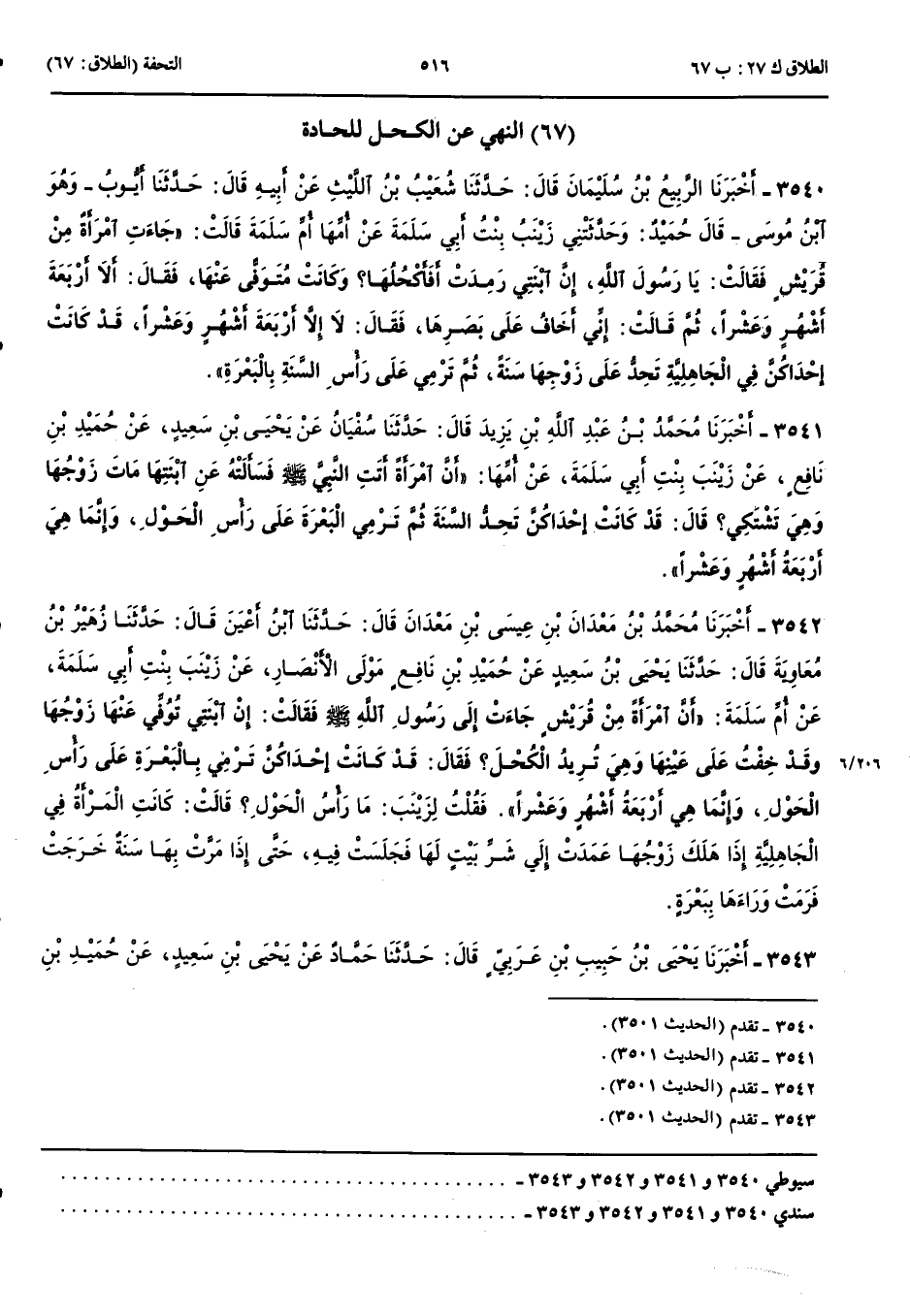 3543 - أَخْبَرَنَا يَحْيَى بْنُ حَبِيبِ بْنِ عَرَبِيٍّ قَالَ حَدَّثَنَا حَمَّادٌ عَنْ يَحْيَى بْنِ سَعِيدٍ عَنْ حُمَيْدِ بْنِ نَافِعٍ عَنْ زَيْنَبَ أَنَّ امْرَأَةً سَأَلَتْ أُمَّ سَلَمَةَ وَأُمَّ حَبِيبَةَ أَتَكْتَحِلُ فِي عِدَّتِهَا مِنْ وَفَاةِ زَوْجِهَا فَقَالَتْ أَتَتْ امْرَأَةٌ إِلَى النَّبِيِّ صَلَّى اللَّهُ عَلَيْهِ وَسَلَّمَ فَسَأَلَتْهُ عَنْ ذَلِكَ فَقَالَ قَدْ كَانَتْ إِحْدَاكُنَّ فِي الْجَاهِلِيَّةِ إِذَا تُوُفِّيَ عَنْهَا زَوْجُهَا أَقَامَتْ سَنَةً ثُمَّ قَذَفَتْ خَلْفَهَا بِبَعْرَةٍ ثُمَّ خَرَجَتْ وَإِنَّمَا هِيَ أَرْبَعَةُ أَشْهُرٍ وَعَشْرًا حَتَّى يَنْقَضِيَ الْأَجَلُ