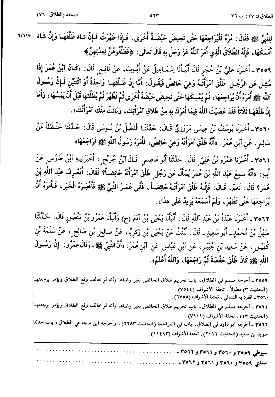 3561 - أَخْبَرَنَا عَمْرُو بْنُ عَلِيٍّ قَالَ حَدَّثَنَا أَبُو عَاصِمٍ قَالَ ابْنُ جُرَيْجٍ أَخْبَرَنِيهِ ابْنُ طَاوُسٍ عَنْ أَبِيهِ أَنَّهُ سَمِعَ عَبْدَ اللَّهِ بْنَ عُمَرَ يُسْأَلُ عَنْ رَجُلٍ طَلَّقَ امْرَأَتَهُ حَائِضًا فَقَالَ أَتَعْرِفُ عَبْدَ اللَّهِ بْنَ عُمَرَ قَالَ نَعَمْ قَالَ فَإِنَّهُ طَلَّقَ امْرَأَتَهُ حَائِضًا فَأَتَى عُمَرُ النَّبِيَّ صَلَّى اللَّهُ عَلَيْهِ وَسَلَّمَ فَأَخْبَرَهُ الْخَبَرَ فَأَمَرَهُ أَنْ يُرَاجِعَهَا حَتَّى تَطْهُرَ وَلَمْ أَسْمَعْهُ يَزِيدُ عَلَى هَذَا