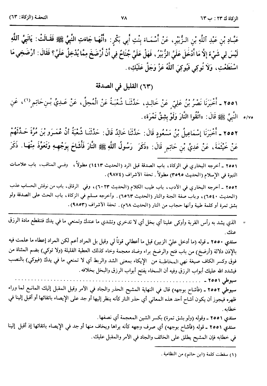 الْقَلِيلُ فِي الصَّدَقَةِ 2551 - أَخْبَرَنَا نَصْرُ بْنُ عَلِيٍّ عَنْ خَالِدٍ حَدَّثَنَا شُعْبَةُ عَنْ الْمُحِلِّ عَنْ عَدِيِّ بْنِ حَاتِمٍ عَنْ النَّبِيِّ صَلَّى اللَّهُ عَلَيْهِ وَسَلَّمَ قَالَ اتَّقُوا النَّارَ وَلَوْ بِشِقِّ تَمْرَةٍ