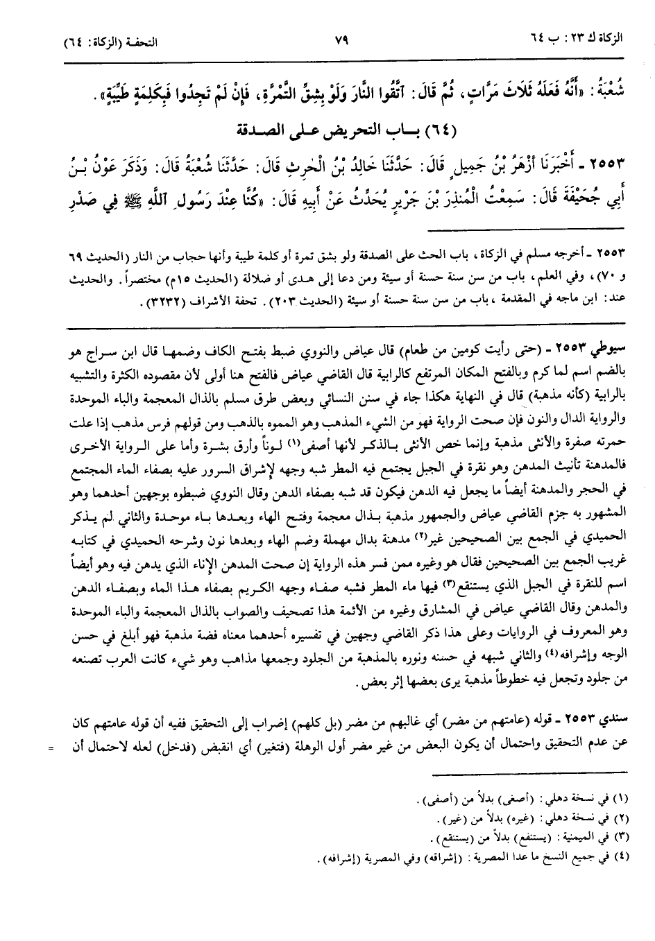 بَاب التَّحْرِيضِ عَلَى الصَّدَقَةِ 2553 - أَخْبَرَنَا أَزْهَرُ بْنُ جَمِيلٍ قَالَ حَدَّثَنَا خَالِدُ بْنُ الْحَارِثِ قَالَ حَدَّثَنَا شُعْبَةُ قَالَ وَذَكَرَ عَوْنَ بْنَ أَبِي جُحَيْفَةَ قَالَ سَمِعْتُ الْمُنْذِرَ بْنَ جَرِيرٍ يُحَدِّثُ عَنْ أَبِيهِ قَالَ كُنَّا عِنْدَ رَسُولِ اللَّهِ صَلَّى اللَّهُ عَلَيْهِ وَسَلَّمَ فِي صَدْرِ النَّهَارِ فَجَاءَ قَوْمٌ عُرَاةً حُفَاةً مُتَقَلِّدِي السُّيُوفِ عَامَّتُهُمْ مِنْ مُضَرَ بَلْ كُلُّهُمْ مِنْ مُضَرَ فَتَغَيَّرَ وَجْهُ رَسُولِ اللَّهِ صَلَّى اللَّهُ عَلَيْهِ وَسَلَّمَ لِمَا رَأَى بِهِمْ مِنْ الْفَاقَةِ فَدَخَلَ ثُمَّ خَرَجَ فَأَمَرَ بِلَالًا فَأَذَّنَ فَأَقَامَ الصَّلَاةَ فَصَلَّى ثُمَّ خَطَبَ فَقَالَ { يَا أَيُّهَا النَّاسُ اتَّقُوا رَبَّكُمْ الَّذِي خَلَقَكُمْ مِنْ نَفْسٍ وَاحِدَةٍ وَخَلَقَ مِنْهَا زَوْجَهَا وَبَثَّ مِنْهُمَا رِجَالًا كَثِيرًا وَنِسَاءً وَاتَّقُوا اللَّهَ الَّذِي تَسَاءَلُونَ بِهِ وَالْأَرْحَامَ إِنَّ اللَّهَ كَانَ عَلَيْكُمْ رَقِيبًا } وَ { اتَّقُوا اللَّهَ وَلْتَنْظُرْ نَفْسٌ مَا قَدَّمَتْ لِغَدٍ } تَصَدَّقَ رَجُلٌ مِنْ دِينَارِهِ مِنْ دِرْهَمِهِ مِنْ ثَوْبِهِ مِنْ صَاعِ بُرِّهِ مِنْ صَاعِ تَمْرِهِ حَتَّى قَالَ وَلَوْ بِشِقِّ تَمْرَةٍ فَجَاءَ رَجُلٌ مِنْ الْأَنْصَارِ بِصُرَّةٍ كَادَتْ كَفُّهُ تَعْجِزُ عَنْهَا بَلْ قَدْ عَجَزَتْ ثُمَّ تَتَابَعَ النَّاسُ حَتَّى رَأَيْتُ كَوْمَيْنِ مِنْ طَعَامٍ وَثِيَابٍ حَتَّى رَأَيْتُ وَجْهَ رَسُولِ اللَّهِ صَلَّى اللَّهُ عَلَيْهِ وَسَلَّمَ يَتَهَلَّلُ كَأَنَّهُ مُذْهَبَةٌ فَقَالَ رَسُولُ اللَّهِ صَلَّى اللَّهُ عَلَيْهِ وَسَلَّمَ مَنْ سَنَّ فِي الْإِسْلَامِ سُنَّةً حَسَنَةً فَلَهُ أَجْرُهَا وَأَجْرُ مَنْ عَمِلَ بِهَا مِنْ غَيْرِ أَنْ يَنْقُصَ مِنْ أُجُورِهِمْ شَيْئًا وَمَنْ سَنَّ فِي الْإِسْلَامِ سُنَّةً سَيِّئَةً فَعَلَيْهِ وِزْرُهَا وَوِزْرُ مَنْ عَمِلَ بِهَا مِنْ غَيْرِ أَنْ يَنْقُصَ مِنْ أَوْزَارِهِمْ شَيْئًا