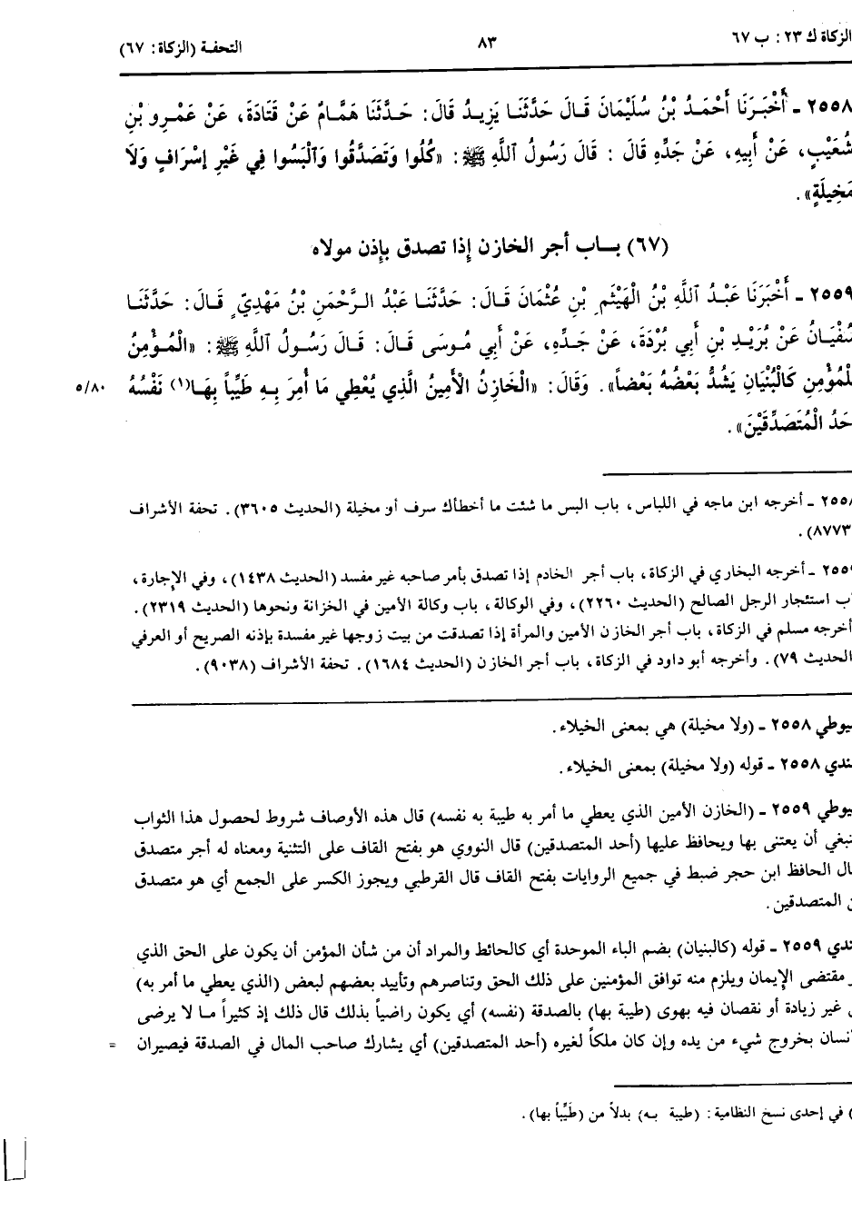 بَاب أَجْرِ الْخَازِنِ إِذَا تَصَدَّقَ بِإِذْنِ مَوْلَاهُ 2559 - أَخْبَرَنِي عَبْدُ اللَّهِ بْنُ الْهَيْثَمِ بْنِ عُثْمَانَ قَالَ حَدَّثَنَا عَبْدُ الرَّحْمَنِ بْنُ مَهْدِيٍّ قَالَ حَدَّثَنَا سُفْيَانُ عَنْ بُرَيْدِ بْنِ أَبِي بُرْدَةَ عَنْ جَدِّهِ عَنْ أَبِي مُوسَى قَالَ قَالَ رَسُولُ اللَّهِ صَلَّى اللَّهُ عَلَيْهِ وَسَلَّمَ الْمُؤْمِنُ لِلْمُؤْمِنِ كَالْبُنْيَانِ يَشُدُّ بَعْضُهُ بَعْضًا وَقَالَ الْخَازِنُ الْأَمِينُ الَّذِي يُعْطِي مَا أُمِرَ بِهِ طَيِّبًا بِهَا نَفْسُهُ أَحَدُ الْمُتَصَدِّقَيْنِ